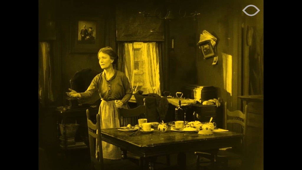 Ma (Margaret Seddon) can frown and smile at once; love and worry are one and the same. As with Norma Talmadge’s character of Minnie, it is the moments when Ma is left alone that move me. There is her pain when Jimmie leaves without kissing her goodbye, and her gladness when he returns and they embrace. (And there, in a picture frame on the wall, is a photo of her with her lost husband. It’s never highlighted, but there it is, the past—her past—present in the background.)