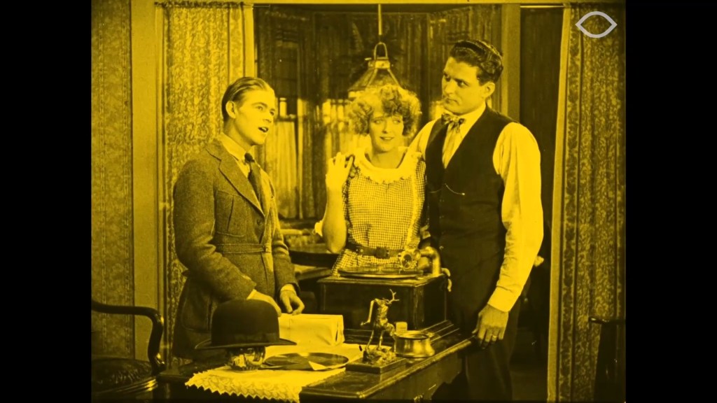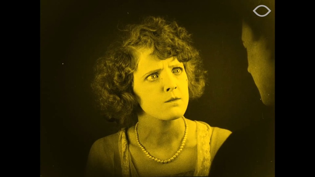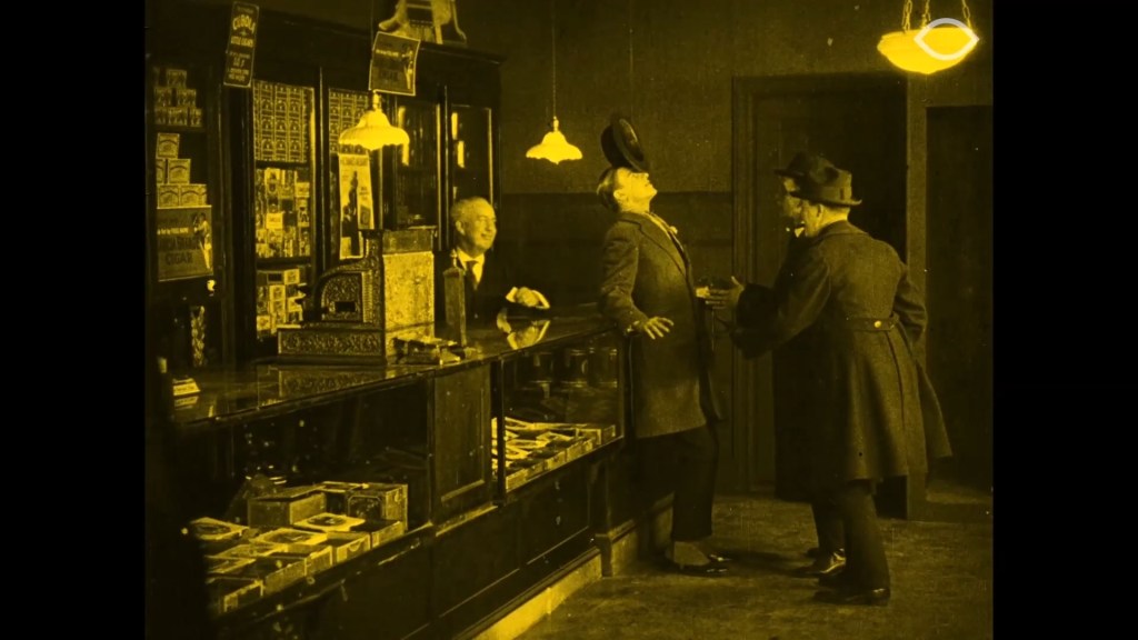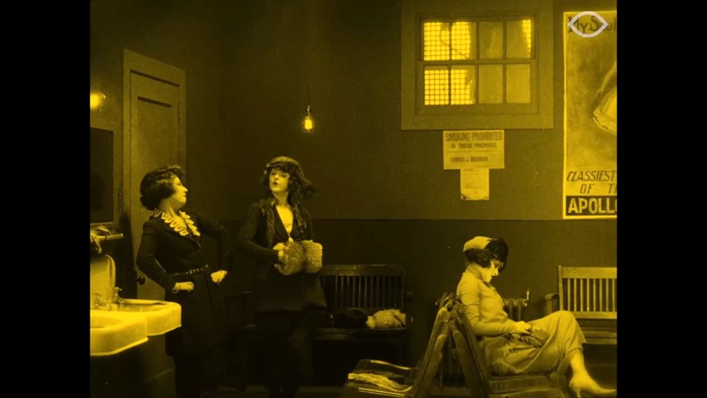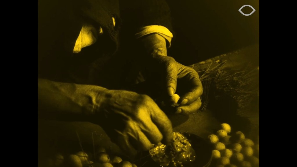 Essie works in a flower shop. The lighting is beautiful, but the work is visibly hard. (I recognize the same real hands that are in the flower shop scenes of Kirsanoff’s masterpiece Ménilmontant (1924).) The texture of hands roughened, hardened, darkened by labour. The texture of human skin. Real faces. A curious sensation: the sheer beauty of the photography and tinting, and the harshness of the work on screen.