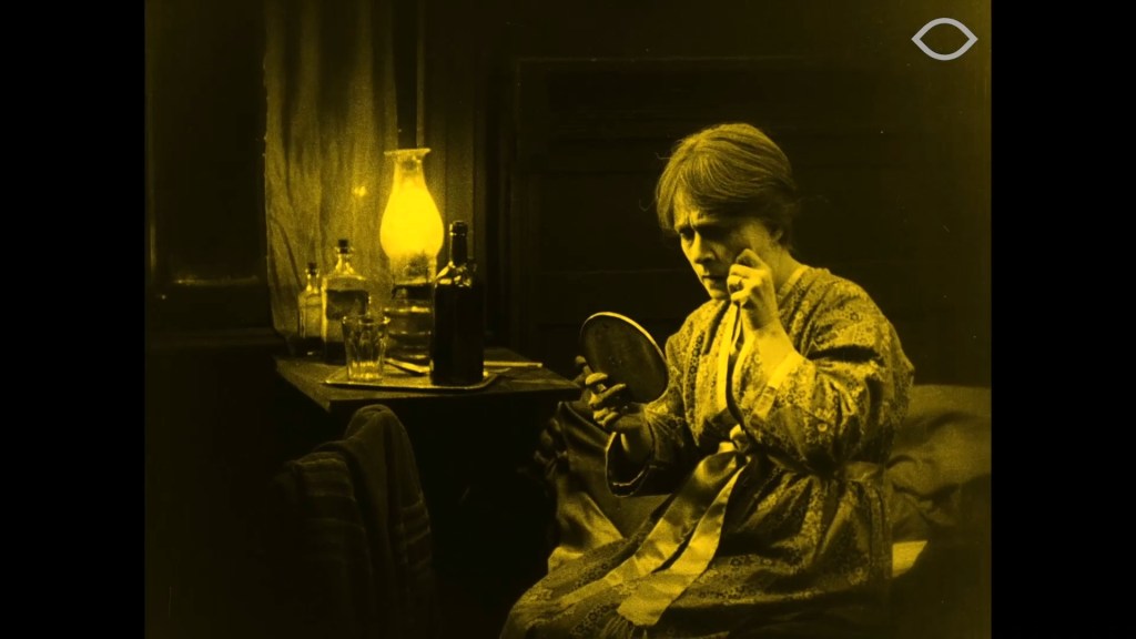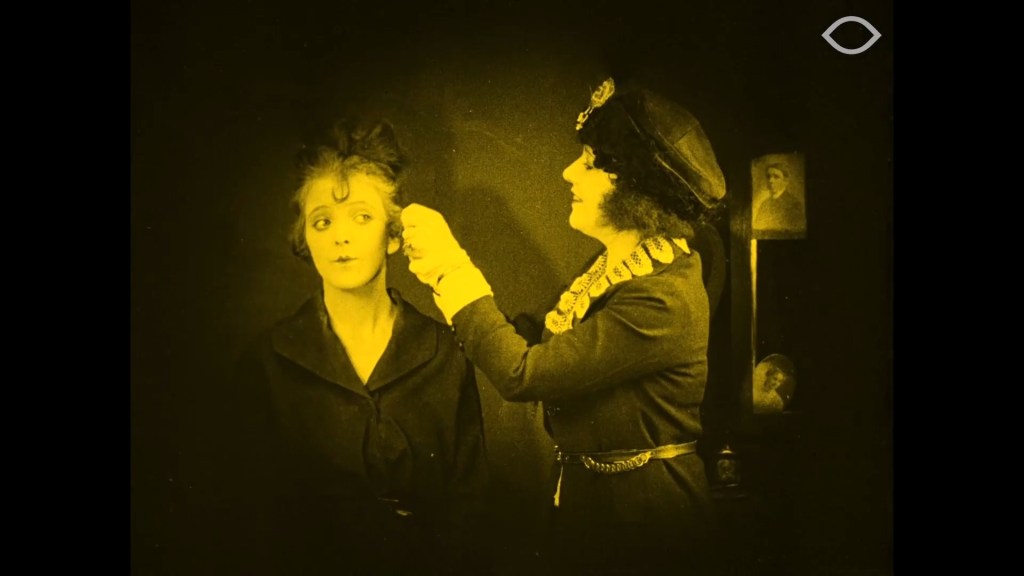 Lulu makes up Essie for her role, and Ma frets again: “It’s not about lipstick—it’s what it might lead to.” It sounds absurd, but Ma speaks as a figure from an earlier generation, the generation voiced in Griffith’s Biograph films, where fears of being a “painted woman” and all that might imply are explored in numerous scenarios. It’s also a worry about how men will read Essie. Ma wants to obey one set of rules (voiced by her, but set by men) to not fall foul of another set of expectations (again, set by men). And on the mirror behind Essie is a photo, indistinct, of her father.