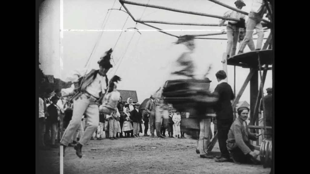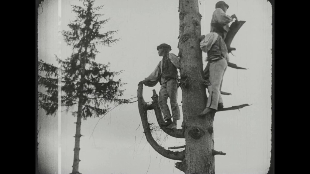 And there before it all are the farmers, cutting and harvesting the grass, sharpening blades, spinning wool, processing flax. Wooden tools, wooden looms. Dexterity passed down over centuries. Highlanders’ music, costumes. A horse and rider against the astonishing backdrop. Sheepskin jerkins, men dancing. Beechwood chopping: boys are woodsmen, axe, and tree at once. Men are lifting one another, twirling around, fighting on benches, barrelling down the hill in ones and twos, and threes, and fours. Children lifting other children with just their legs. These are bodies with years of labour already in them. Cows wander past the twirling acrobatics of the shepherds. A game called “train engine” in which bodies are the carriages and engine. But how many of them have ever seen a train? “Strength in the legs”, “Strength in the hands”, “Pulling tomcat”. “Flipping the boys over on a stick”, “Doing the horses”, children riding atop children riding atop children. “Tying to the stick”, children turned into knots. Adults carrying bundles of children across a grassy ridge, behind them the mountains. The film stops, but it could go on forever—if history were not inevitably to intervene.