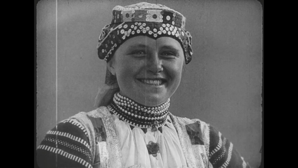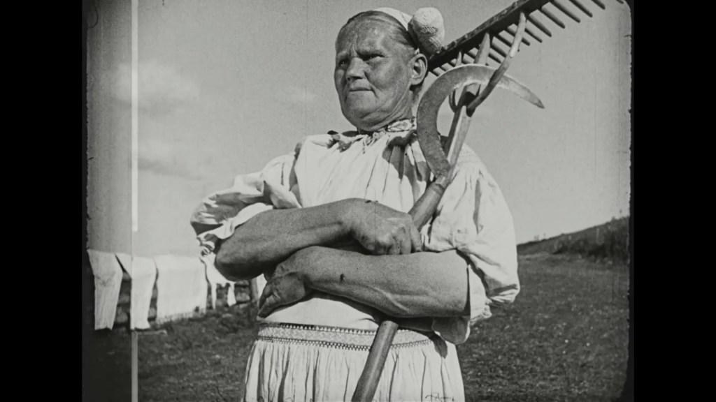 What am I to make of all this? The film has a hypnotic rhythm to it. Everything is presented with very little comment. Filmic interventions are chiefly noticeable in the details: when the people step forward for the camera. But in these instances, you can sense the real emotions: embarrassment, amusement, awkwardness, reticence. Yes, the people are performing for the camera, but they’re clearly performing for each other as well. There is a rough-and-ready feel to even the most elaborate scenes. And everything takes place before the immense landscape, on natural stages that both ground the inhabitants and stretch beyond them. These are lives led on unending swathes of grass, under enormous skies. This is not the managed poetry of a Dovzhenko, but a looser assemblage of faces and landscapes. People and places determine the film’s shape, its rhythm. And I love watching these silent folk in these silent spaces. The majesty of a tangible reality, removed from our grasp and set apart from our time.