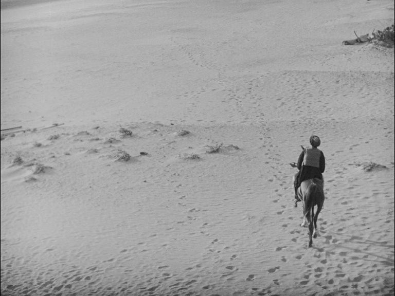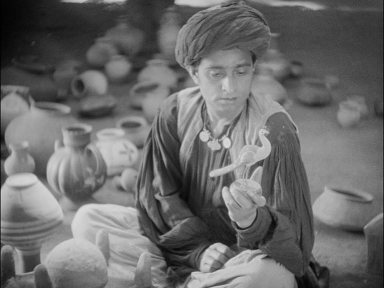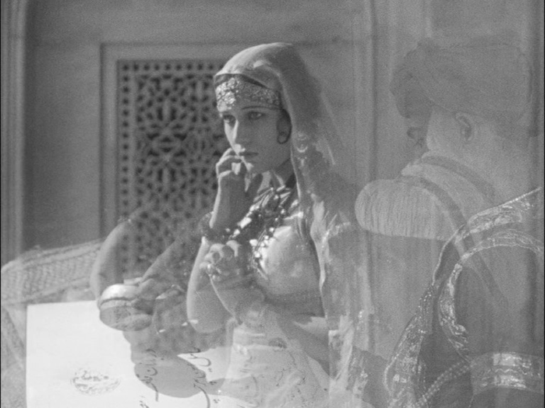 Only when the intrigue with Dalia got going did I start to be fully engaged. Here at last was a character with a bit more personality, more of a sense of a human being rather than a storybook figure (the poor potter, the abandoned princess, the noble prince). It is her actions that also seem to inspire Osten to be a bit more inventive. When Dalia forges the stamp on the pass for Shiraz, we see her in a mid-shot crouched by the chest with the official stamps. Osten cuts to what appears at first to be a blank screen. A second later, Dalia’s hand (we know it’s her hand because of the number of jewels it bears) appears slowly from left of frame, passing the document to another hand that appears from the right. Cut to a close-up of Shiraz, waiting at the wall to receive the letter. It is silence, I think, that makes the shot of the hands so startling. The transition is purely visual, and although it offers narrative continuity (the document being forged, the document being transported, the document being delivered), visually the out-of-focus background of a white wall is a stark disruption from the last shot of a dark interior space. Without any kind of background sound—even the gentle hiss of an unoccupied soundtrack—the cut to the white space is startling. Later in the film, Dalia’s thought process is shown through superimposition: we see the document again, the hands, the destination, the threat of discovery. All this is indicative of the more dramatic elements of the story: it is Dalia who tries to change events, to rely on her own wit rather than the will of Allah or the whims of the Prince. Thus Osten must make more of her, more of her agency. When she is removed from the film, the remainder of the story once more becomes a rather uninvolving series of pictures.