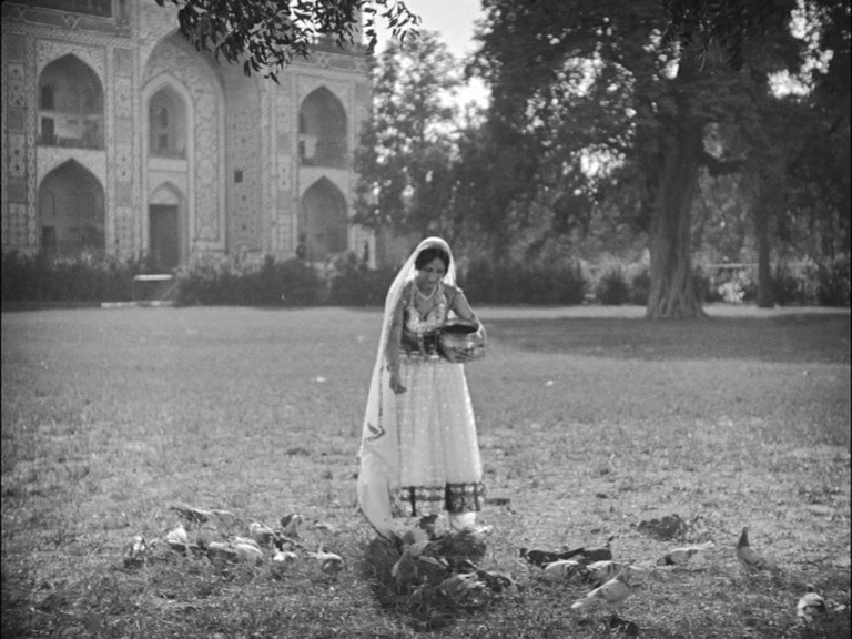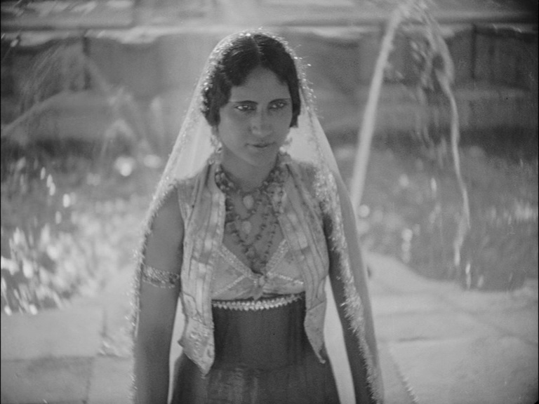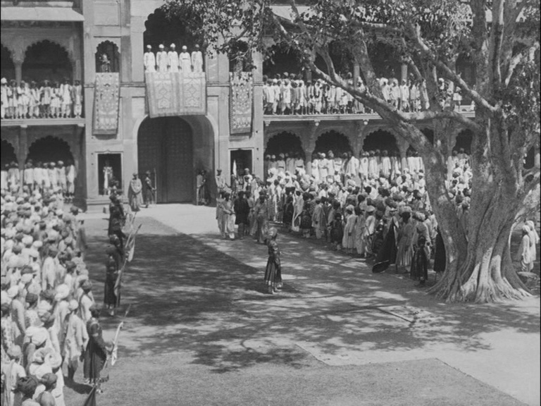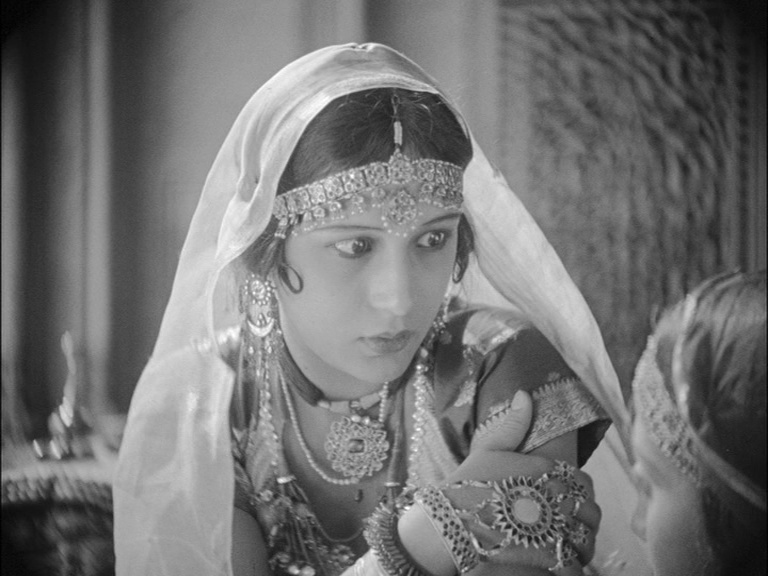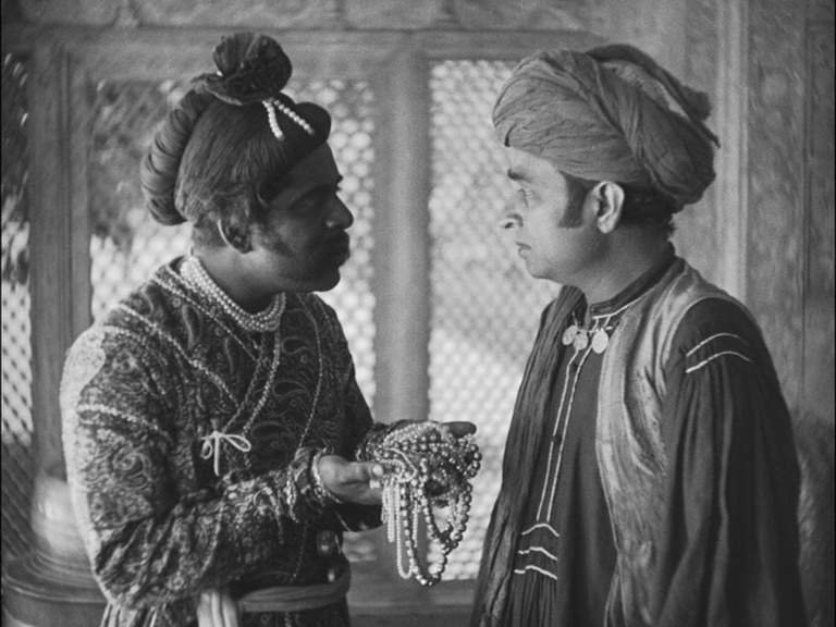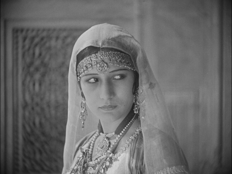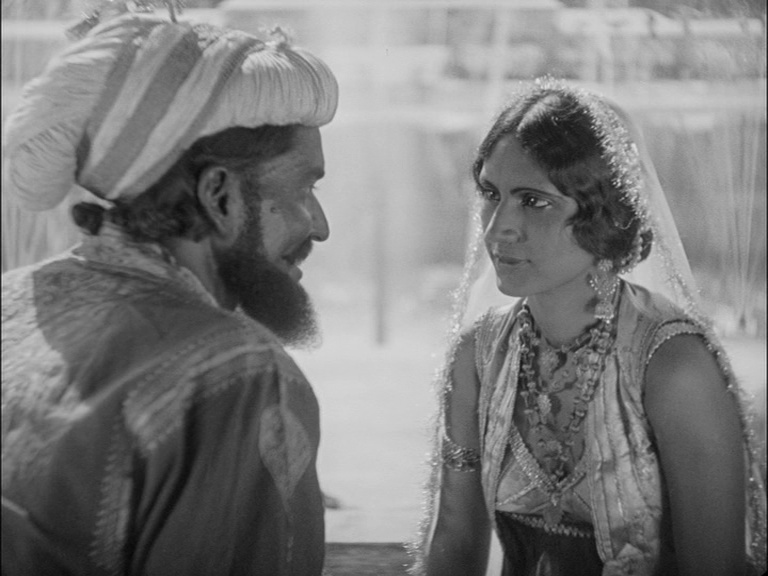 This is not the case with Seeta Devi, whose performance as the scheming Dalia is by far the most engaging in the film. You can read the thoughts pass across her face, the emotions light up her eyes. The camera knows what to do with her, too: it gives us plenty of closer shots to show her expressions, her gestures of impatience, seduction, desire, anger. Devi is absolutely magnetic: not merely beautiful, but agile and demonstrative—she’s truly communicative on screen. It’s noteworthy that the film’s titular hero is not used as the face for the BFI’s poster, nor still the film’s leading lady. Instead, it is Seeta Devi who takes centre stage, and anyone looking at the re-release posters or the Blu-ray box would think that she plays the character called Shiraz. Devi was Anglo-Indian, born Renee Smith, and I noted when watching the film that she’s one of the few people on screen who I could lipread speaking English. Doing a little digging online (weirdly enough, on her French Wikipedia page), I find that Devi spoke neither Hindi nor Bengali—and that this was one of the reasons her career in India petered out swiftly after the arrival of sound.