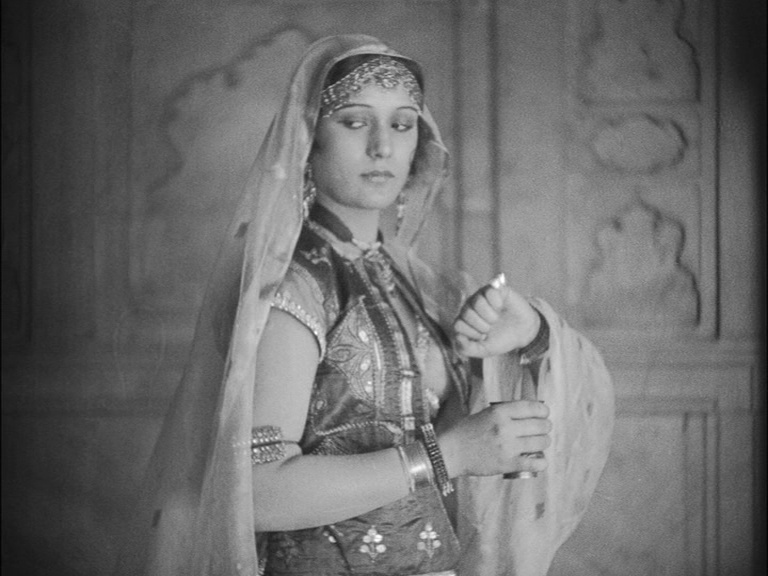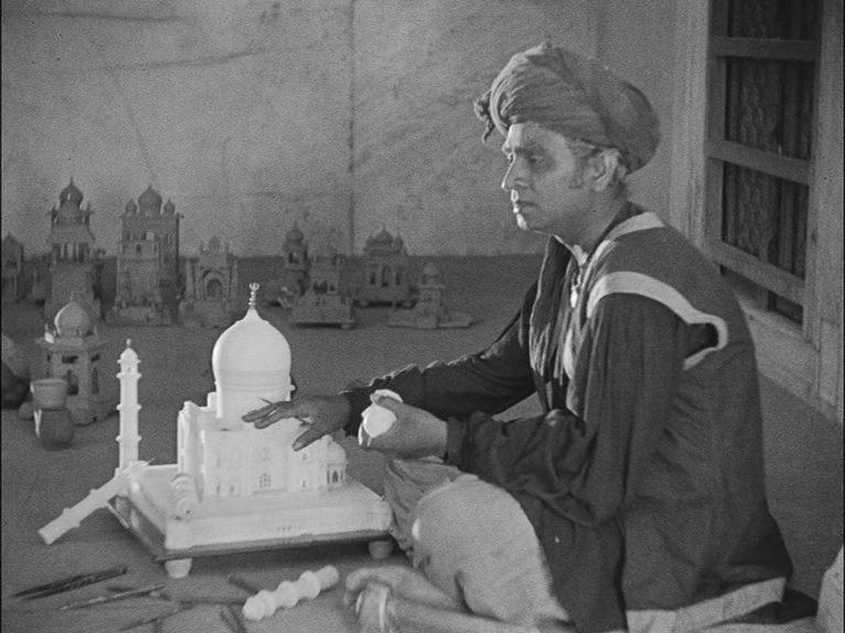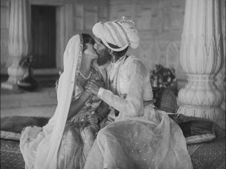 I will let you know the whole story, since it retells the inspiration behind one of India’s most famous landmarks: the Taj Mahal. In Pal’s partially fictionalized version, the child princess Selima is found amid the wreckage of an ambush. Taken home by a potter, she is adopted and raised by his family. The adult Selima (Enakshi Rama Rau) becomes the object of infatuation of the potter’s son Shiraz (Himansu Rai). But she is spotted and kidnapped by a gang of slavers and eventually bought by an agent of Prince Khurram (Charu Roy). Shiraz finds his way to the city where Selima is now part of the Prince’s household, but is unable to intervene as she and the Prince fall in love. This in turn frustrates Dalia (Seeta Devi), a general’s daughter who had hoped to marry the Prince. With the help of her maidservant (Maya Devi), she forges a pass to let Shiraz into the palace—where he is caught with Selima. The Prince orders his execution “under the elephant’s foot” (yes, literally) but when he learns the truth of Dalia’s scheme—culminating in the poisoning of her maid to leave no trail of evidence—he lets Shiraz go. Selima’s true identity is discovered and—since she has royal blood—the Prince is now free to marry her. Eighteen years pass, and Shiraz—now blind—helplessly pines for Selima. When the latter dies and the Prince commissions a design for a monument in her memory, Shriaz’s model is chosen. The two men build the Taj Mahal. THE END.