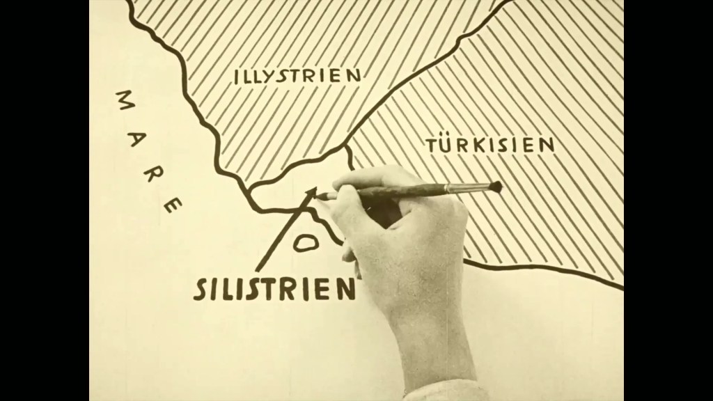 A German film with French titles. “Somewhere in Europe”, we find the realm of Sillistria. A charming way to illustrate the film’s fictional location: a hand draws a map with a brush. We see Sillistria, sandwiched between two other fictional kingdoms, Thuringia and Illyria.