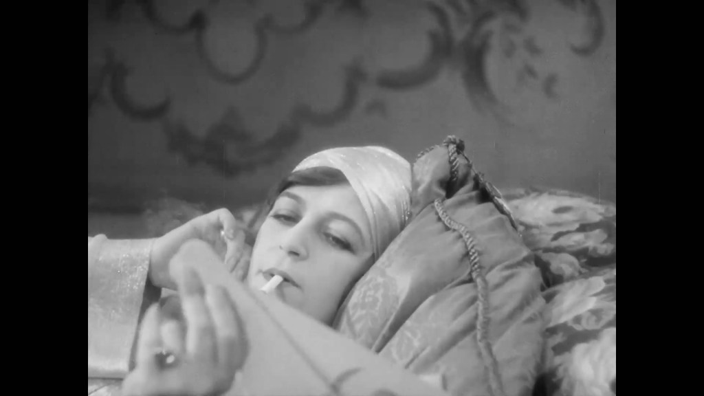In the court of Sillistria, Count Geza flirts with the Princess. The arrival of Dschilly causes chuckles and consternation. Elegant tracking and lift shots of her entry into the hotel. And a panning shot of her disappointed glance round the paltry room. The “bathroom” is simply a portable metal tub. Dschilly looks the most modern of all the characters: her smoking, her fashionable beret, her elegant yet simple dresses and shawl. And the modernity of her knowingness, her visible intelligence. Here’s a woman who knows what she wants and will find a way to get it. Charming, yes, but direct too.