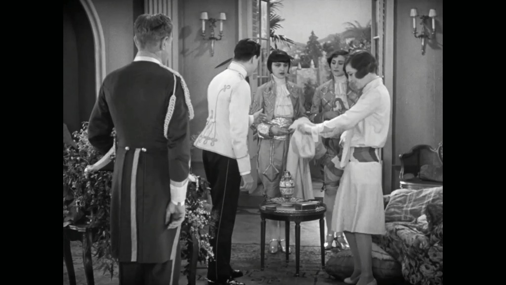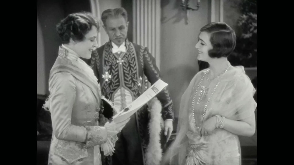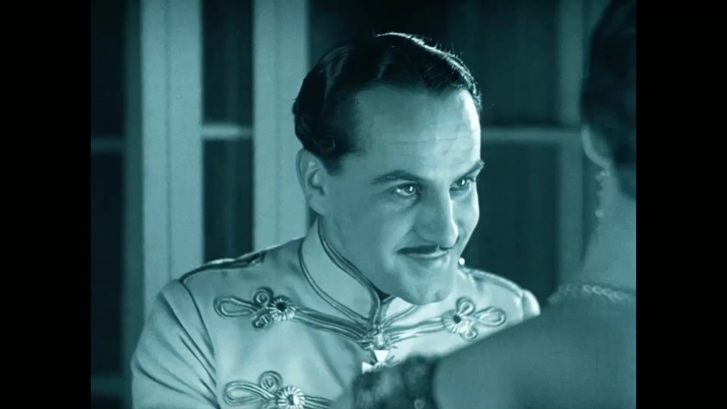 Princess Petra (Diana Karenne): a lovely close-up revealed when she lowers her fan. She is cool, languid. Eyes that move expressively, assuredly. She smokes. A modern Princess for an ancient kingdom. We are told about Thuringia and Illyria, to which the Princess is determined to sell an island, Petrasia. The Chancellor threatens to resign. “You want me to have to walk around naked?” she asks, a twinkle in her eye. She shows him her bills. The Chancellor kisses her hand, shrugs, laughs.