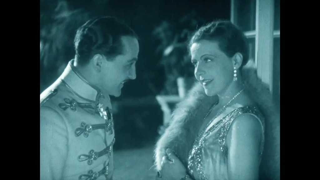 That night a soiree (tinted a lovely rose). The comic adjutant is here again, grinning and flirting and taking a sneaky drink as he serves the ambassadors. Geza and Dschilly are dancing, the camera following their movements on the dancefloor. Thence to the gardens, a quick kiss on the hand. But Dschilly wants the island. Geza wants to advance his career. The stakes are set out. (On his way out, Geza plays a sly trick: he tells the concierge that Dschilly does not wish to be woken.)