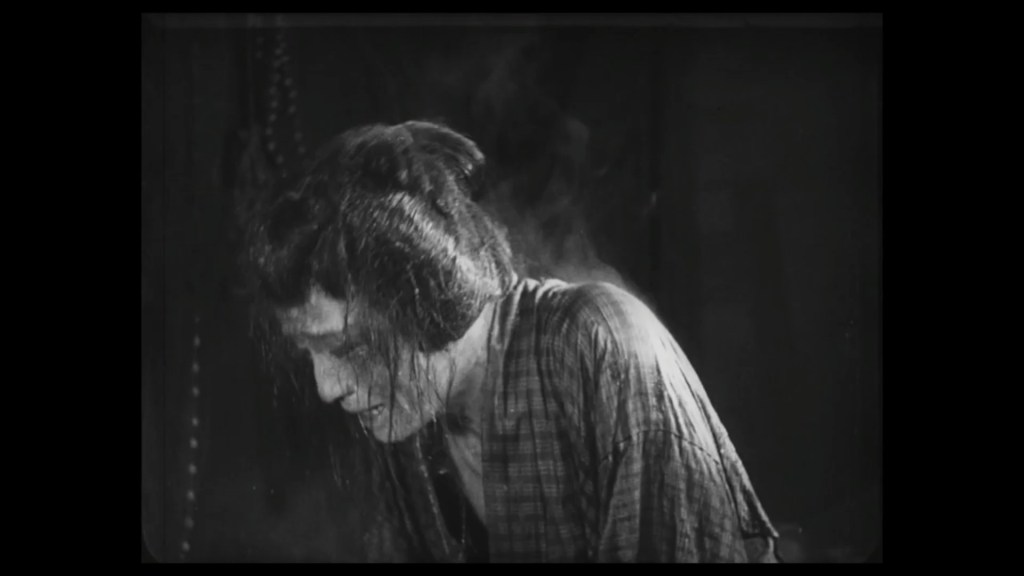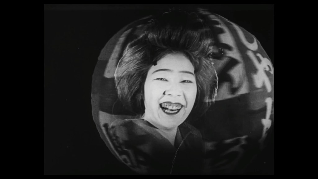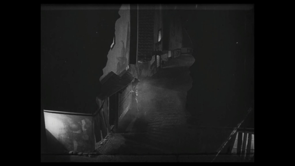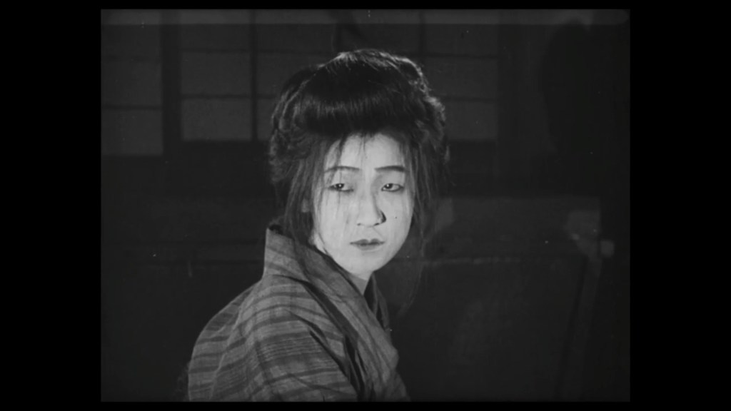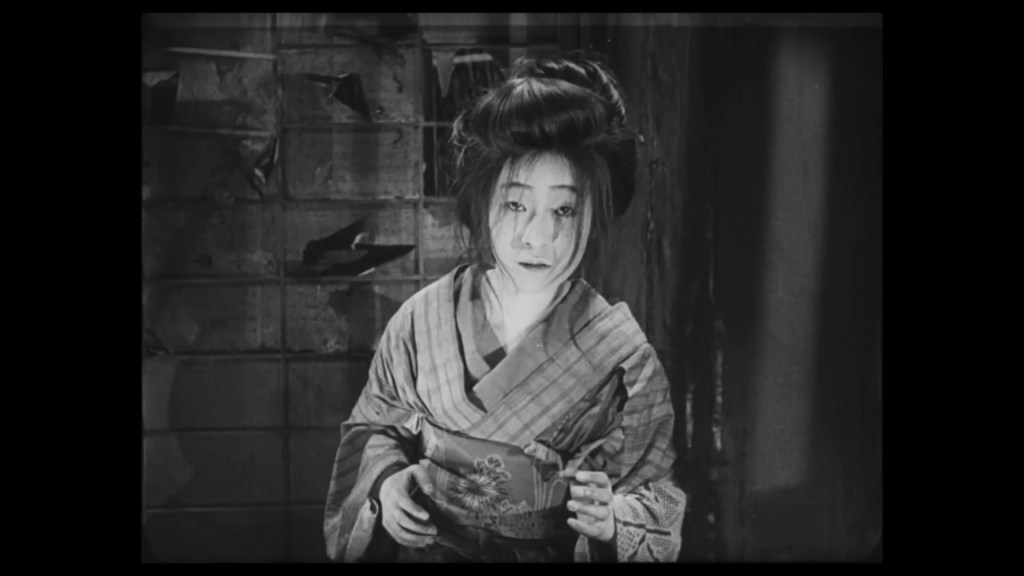Right, now we’re back on track. A real rarity! Unavailable in any other format! Kinugasa’s film seems to have been released under multiple English-language titles. It’s listed variously as “Crossways”, “Crossroads”, and “Slums of Tokyo”. The dual German-English intertitles of this print gave the title as “In the Shadow of Yoshiwara”. There were no restoration credits to clarify the source of this print, which made me wonder about its provenance. There are evidently some missing titles, if not other material. (For example, one title announces “end of fourth act” despite no other “act” titles appearing in the print.) Furthermore, the English text is often awkward and rife with spelling errors. (The wording offers some very literal translations of the German text.) When and where was this print made?
