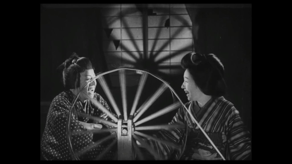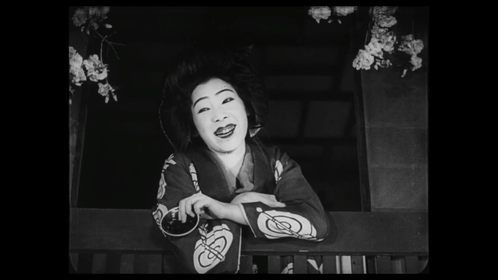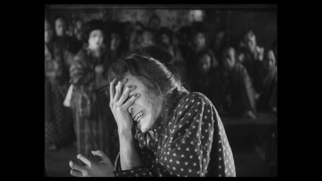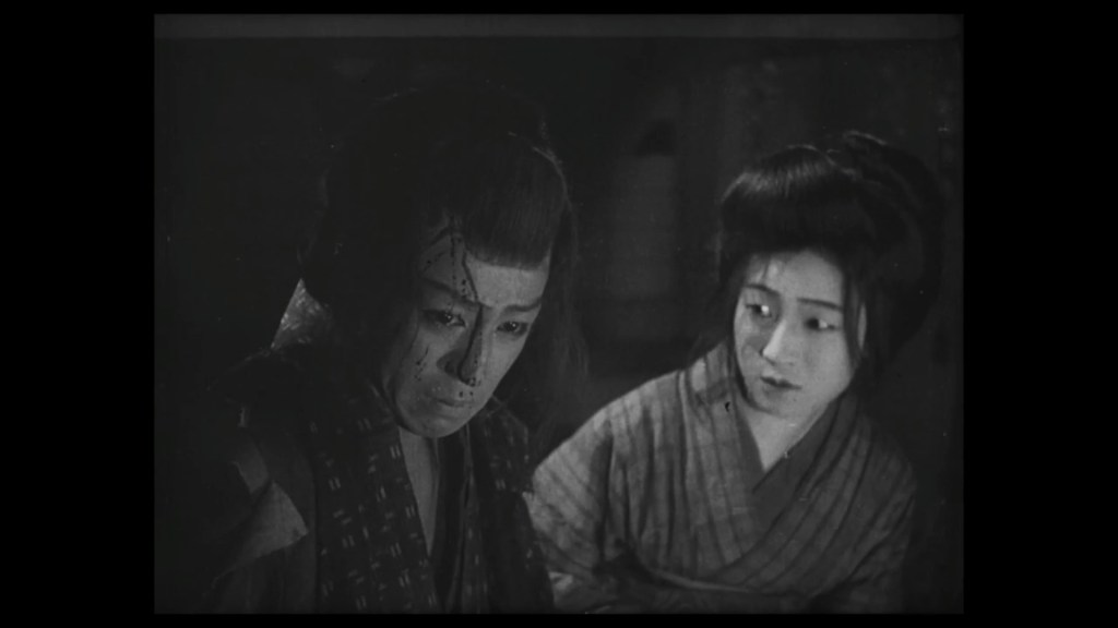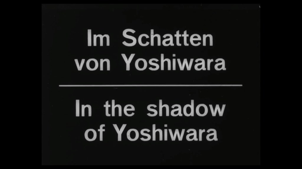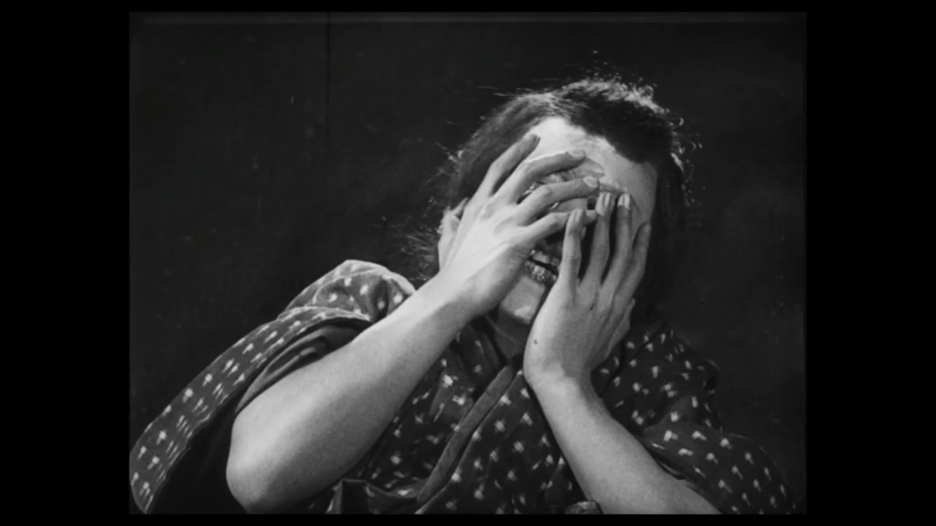 Right, now we’re back on track. A real rarity! Unavailable in any other format! Kinugasa’s film seems to have been released under multiple English-language titles. It’s listed variously as “Crossways”, “Crossroads”, and “Slums of Tokyo”. The dual German-English intertitles of this print gave the title as “In the Shadow of Yoshiwara”. There were no restoration credits to clarify the source of this print, which made me wonder about its provenance. There are evidently some missing titles, if not other material. (For example, one title announces “end of fourth act” despite no other “act” titles appearing in the print.) Furthermore, the English text is often awkward and rife with spelling errors. (The wording offers some very literal translations of the German text.) When and where was this print made?