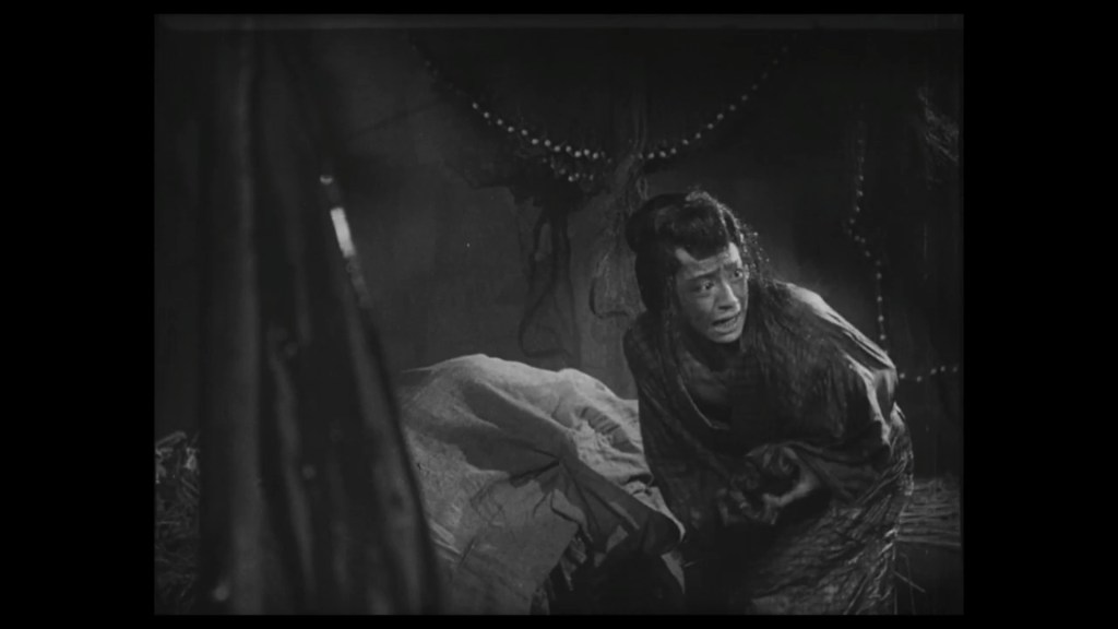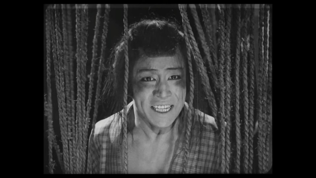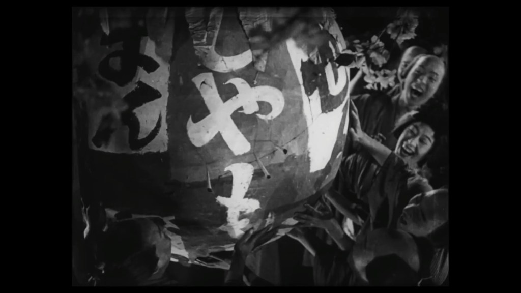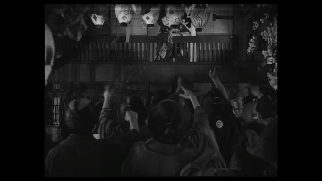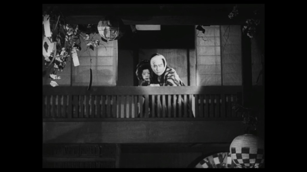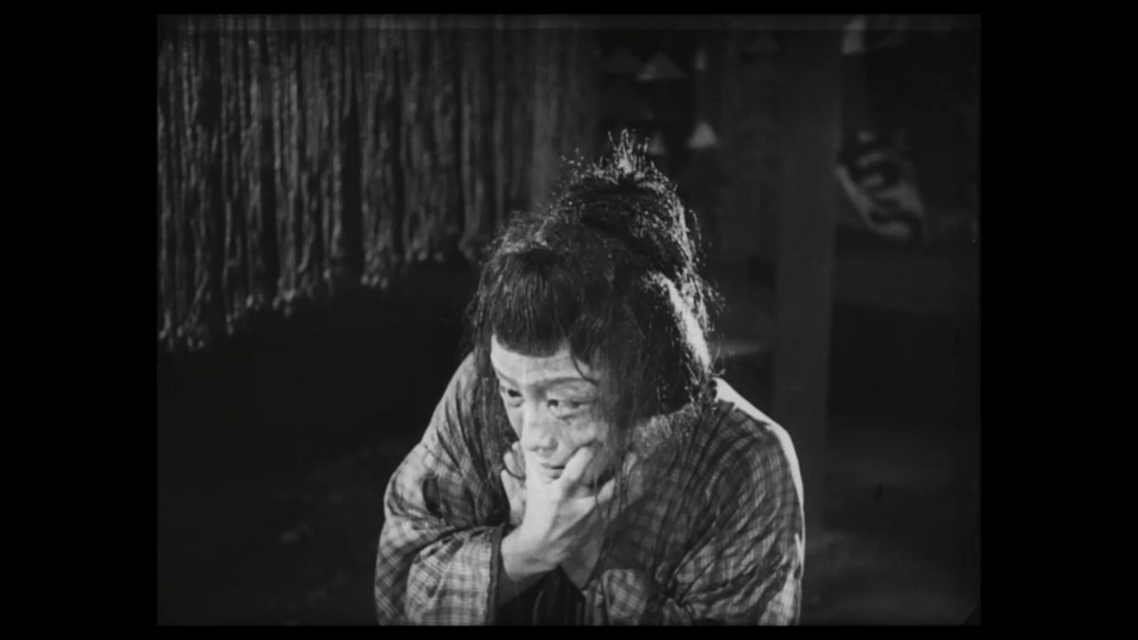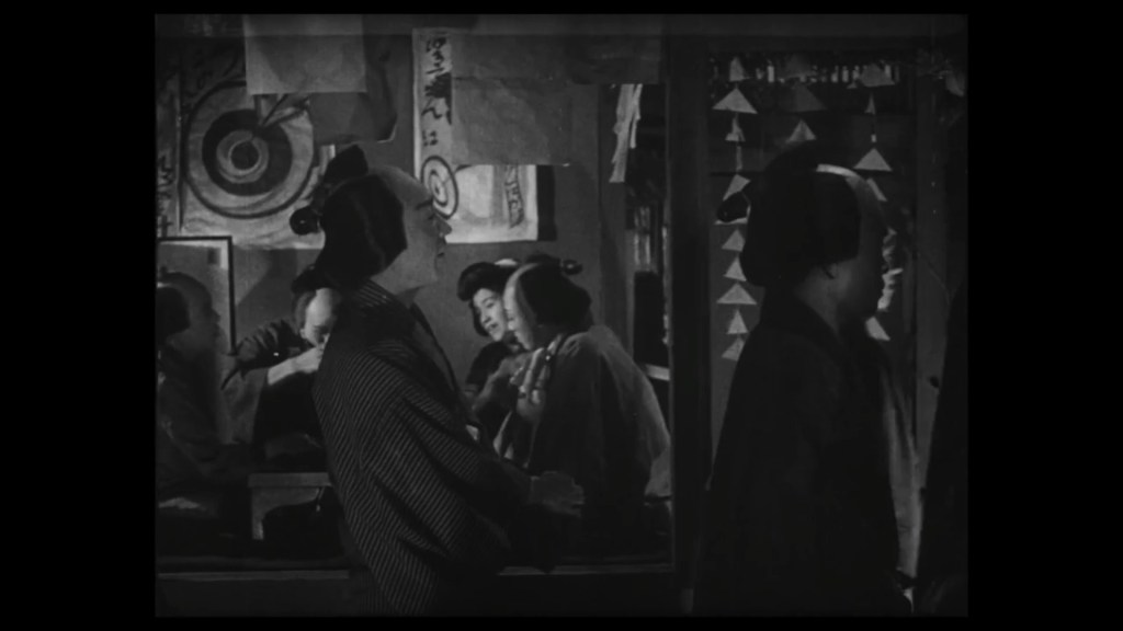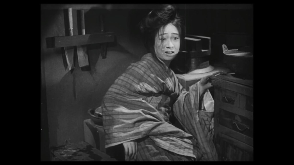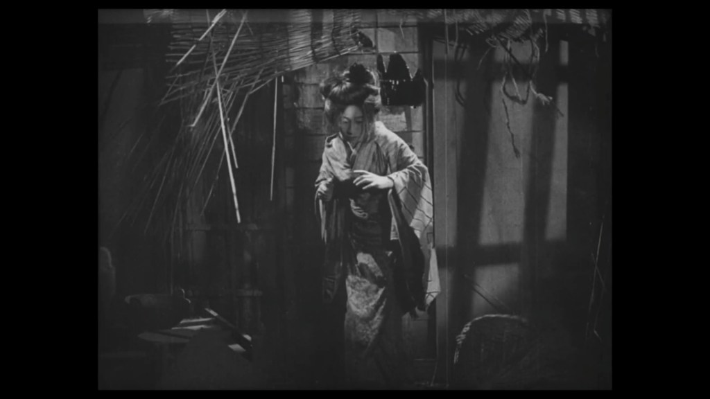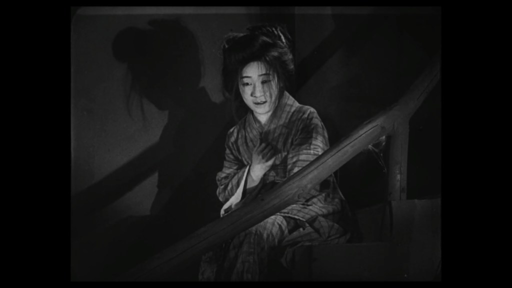 This reservation aside, the film was excellent. The plot is simple, the drama concentrated – claustrophobic. In c.1850 Tokyo, a brother and sister live in a poor flat near Yoshiwara, the red-light district. The brother hangs out amid the frenzied atmosphere of gambling, stealing, and whoring. He is obsessed with O-Ume, who works in a brothel. He fights a rival for her affections, but the rival blinds him with ash. Believing he has killed his opponent, the blinded brother finds his way home. But the sister needs money to help him, so she is faced with selling herself either to her creepy neighbour or to the procuress of the brothel. The brother’s blindness is lifted in time to witness his sister stabbing the neighbour in self-defence. The pair flee to the city’s outskirts, but the brother is drawn back to O-Ume. He sees her with the rival he believed he had killed. His blindness returns; he collapses and dies in a fit of madness. END.