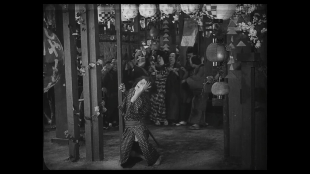 This transformation of physical space into psychological space is heightened by Kinugasa’s superb camerawork. There is a wonderful array of dramatic lighting, sudden close-ups, creeping tracking shots, sinister high-angle viewpoints. Just see how the first montage of the Yoshiwara gambling dens is rendered more effective by the prowling camera, the hallucinatory superimpositions, the leering close-ups. There is a fascinating balance between subjectivity and objectivity in the way the camera shares and/or observes the way characters experience the world. When the brother is blinded, for example, there is a dazzling flurry of pockmarks and lightning bolts that bubbles over the screen: we share the brother’s onrush of terror and bewilderment. But immediately afterwards, as the brother stumbles back and forth through the cackling crowd of gamblers, the camera pitilessly tracks back and forth, keeping its distance, watching him fall apart. The shock of subjectivity is followed by the chill of detachment.