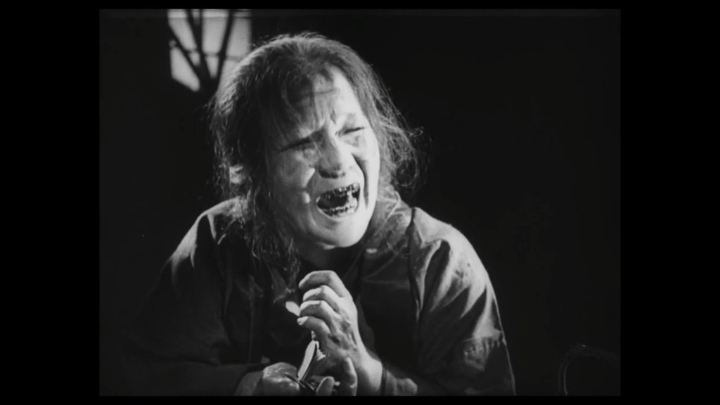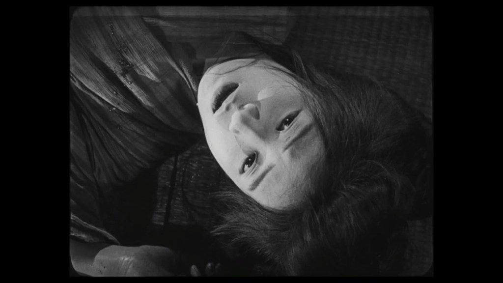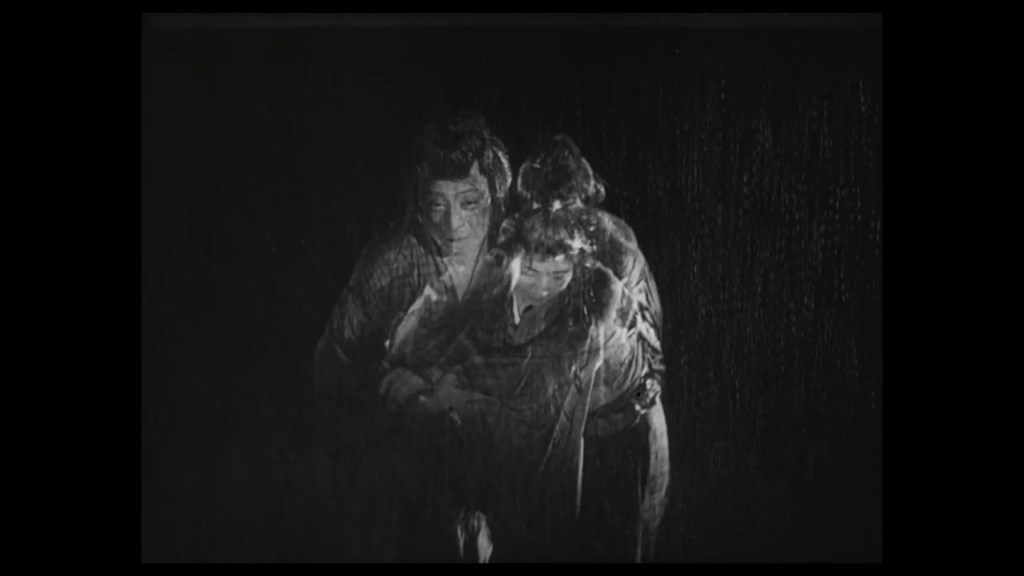The film’s blend of melodrama and expressionism comes to its climax in the final scenes. The brother recovers from his blindness, and we see the world as he sees it: darkness distorting, weird patches of light, solid objects rippling. But the reality he wakes to is like a living nightmare: the toothless, dishevelled neighbour assaulting his sister, the body falling before him. A series of dissolves transform the scene into a kind of vision, as though these images were also emerging from the brother’s former blindness. The siblings’ rush through the dark and rain is equally nightmarish, and the hut in which they shelter hardly comforting. Their bodies are soaked, and the marvellous detail of steam rising from their shoulders is both realistic and expressive. The titular crossroads of the film appears at the end like a slice of another nightmare. It’s two pale streaks of pathway, crisscrossing a despairingly black landscape. Dim, bare trees in the foreground, dim, distant houses in the distance. The brother crosses this otherworldly space to reach Yoshiwara, where he sees O-Ume and the rival he imagined he has killed. With a rapid montage of hallucinatory images, superimpositions, and distortions, he clutches his eyes and collapses – “This is the end!” he screams. And it is. There’s just one last scene: here is the sister, alone at the crossroads, hesitant, afraid. It’s a superbly disquieting ending to this bleak and gripping film. With touches of German expressionism ala Fritz Lang and French impressionism ala Abel Gance, Kinugasa’s Jûjiro still holds its own – it’s a concentrated, nightmarish, unsettling film.