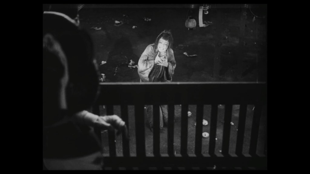 If the plot is mundane, the realization is superb. There are multiple flashbacks, which makes the narrative more complex – more subjective, more strange – than the above synopsis suggests. But it’s the world of the film that is so compelling. The whole story seems to take place at night, or else within a kind of contained nightmare. That might be a starless sky overhead, but it might as well be the void of any reality beyond the comfortless tenements and cacophony of the gambling dens and brothel. It is a forbidding, studio-bound world. It rains (and often you can see the characters’ breath) but there is no sense of the natural world beyond the dark streets, the grimy interiors. The characters who inhabit this place are, apart from the sister, forbidding and grotesque. From the frenzied brother, forever clutching his face, his throat, his blinded eyes, to the creepy, toothless neighbour, the sinister procuress, the bandaged rival and the cackling O-Ume – everyone is unwelcoming, exploitative, angry. The sets in which these characters live, or struggle to live, are marvellous. There are realistically threadbare walls, tattered paper doors, broken windows, forbidding staircases. The world of Yoshiwara is more complex, with multiple interior spaces joined by ornate panels, blinds, windows within windows. Kinugasa turns this space into a bewildering, overwhelming maze: swinging lanterns, spinning umbrellas, tumbling betting balls. And all filled with the mad bustle of drinking, gambling, laughing crowds. The combination of studio-bound sets, dim spaces, and claustrophobia feels very expressionist. (The theme of a wayward man abandoning a homebound woman – not to mention its moody rendering – made me think of Die Straße (1923), shown at Pordenone last year.)
