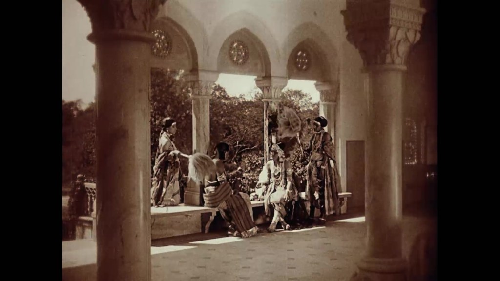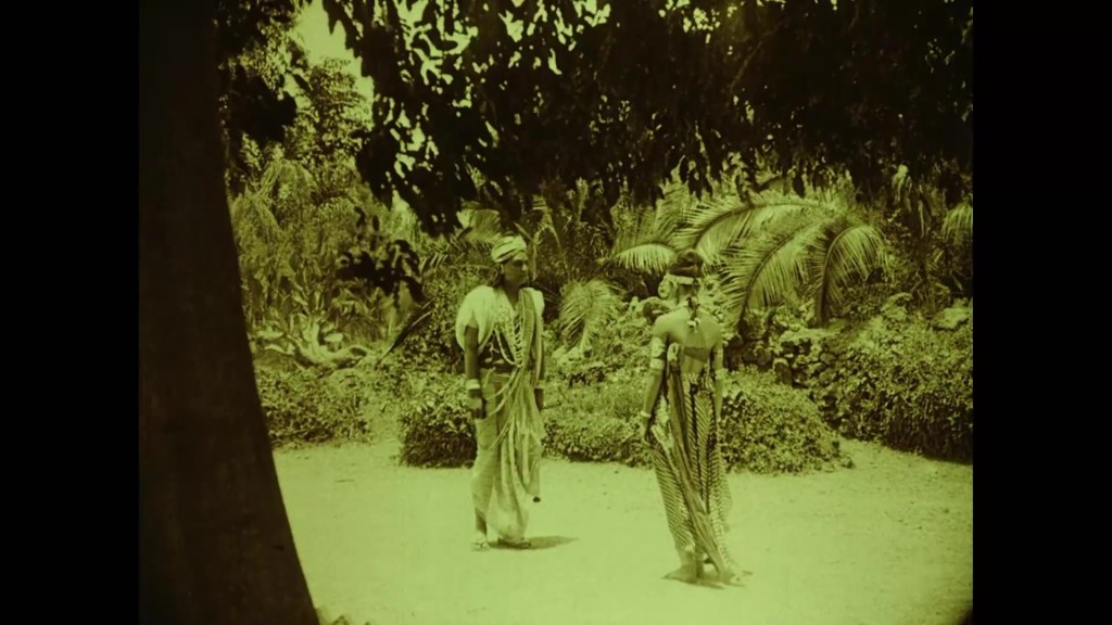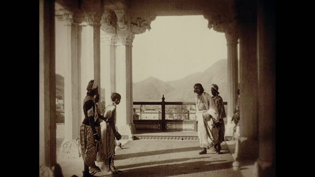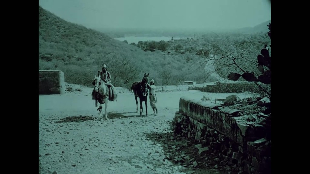 All this said, I didn’t care that the film wasn’t awash with stylistic flourishes or deft pieces of editing or camerawork. I didn’t care because this was one of the most beautiful films I’ve seen in a long time. Restored from a contemporary print released in the UK in 1926, Prem Sanyas is exquisitely tinted and toned and simply glows. For all that I have criticized (or at least, damned with faint praise) the lack of “style”, this film has no need to be showy when it uses real locations so well. So many views make you want to gasp, to spend time gazing at the frame. From ornate temples and elaborate palaces to dusty streets and overgrown gardens, this film is as astonishing document of time and place. I could rave for hours over the photography, the way the tinting seems to make you feel the heat and the haze and the dust and scent of the locations. I’ve taken a large number of image captures, but I could have taken any number more. The drama might have been inert, even inept, but I was captivated by the film itself – by the sheer aesthetic gorgeousness of the image.