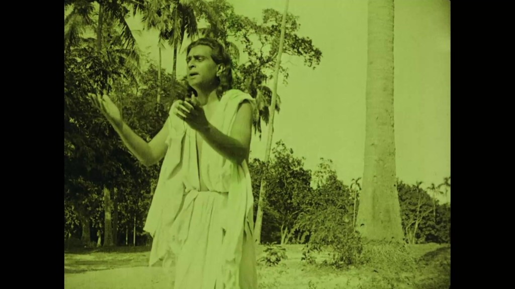 As the king and queen, Sarada Ukil and Rani Bala are pleasingly unpretentious. Free from any posturing, gesturing, or theatrics, they are as real as figures from a mystery play – ordinary and extraordinary at the same time. Then there’s Seeta Devi, who was by far the most striking presence in Shiraz. Here, she looks scarcely more than a child – indeed, she was thirteen at the time of filming. A real child to play the prince’s child bride. In my piece on Shiraz, I remarked that she was the only performer to offer a really defined performance, i.e. someone who was palpably playing for the camera, for us. Her role, as a manipulative figure wishing to shape the drama, perfectly suited her performance style. In Prem Sanyas, she is free of mannerisms, of technique. True, she is not given much of a character to embody, but nevertheless there is a naturalness to her embodiment of Gopa that is moving in itself. And though she has yet to grow into her adult body, or adult confidence as a performer, she is still radiant on screen.