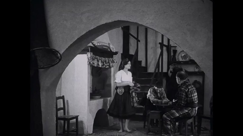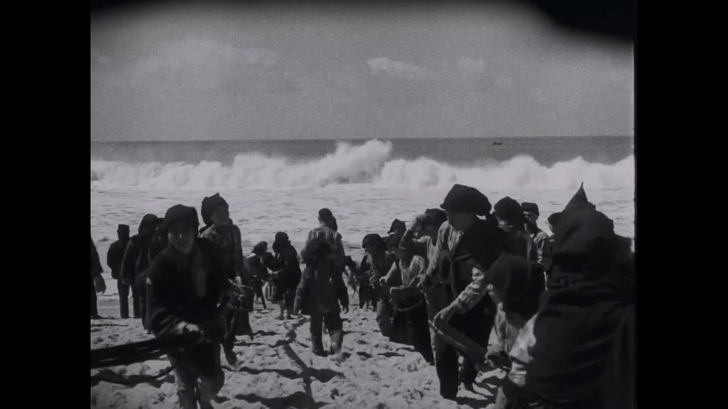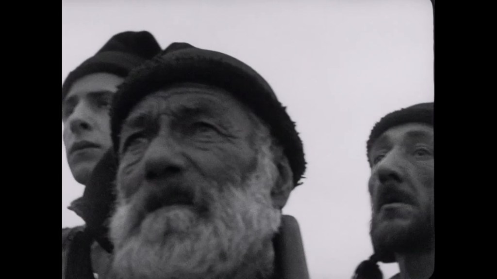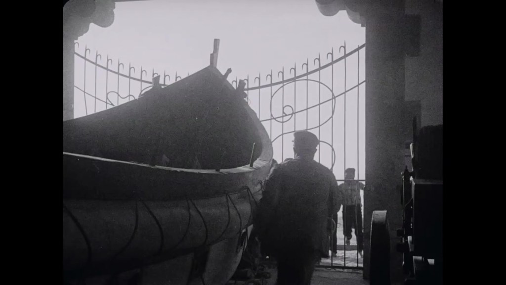 This was a superb film. A masterpiece, in fact. It’s a document of a time and a place, and of a people – and it’s a romance, a fable, a beautiful fiction. Filmed entirely on location and featuring numerous extras drawn from the local population, this was an absolute joy to watch. It has a documentary-like sense of life and movement, plenty of handheld camerawork, enhanced with some dynamic editing – from overlapping dissolves to rapid cutting. The opening shots of the town and sea are hypnotically beautiful. I loved seeing the town and the beach, the physical effort of fishing, the manual labour of pulling in the boat, the sweat and sun-darkened skin of the people. When Falacha’s boat heads out into the storm, there are stunning shots of locals, all dressed in black, standing on the cliffs. And when the rescue mission begins, there is an extreme long shot, looking down at the paths toward the beach. The inhabitants of Nazaré are tiny specks against the spectacle of coast and sea. We see them pouring down the hillside, rushing along the beaches, dark silhouettes against the vast white waves.