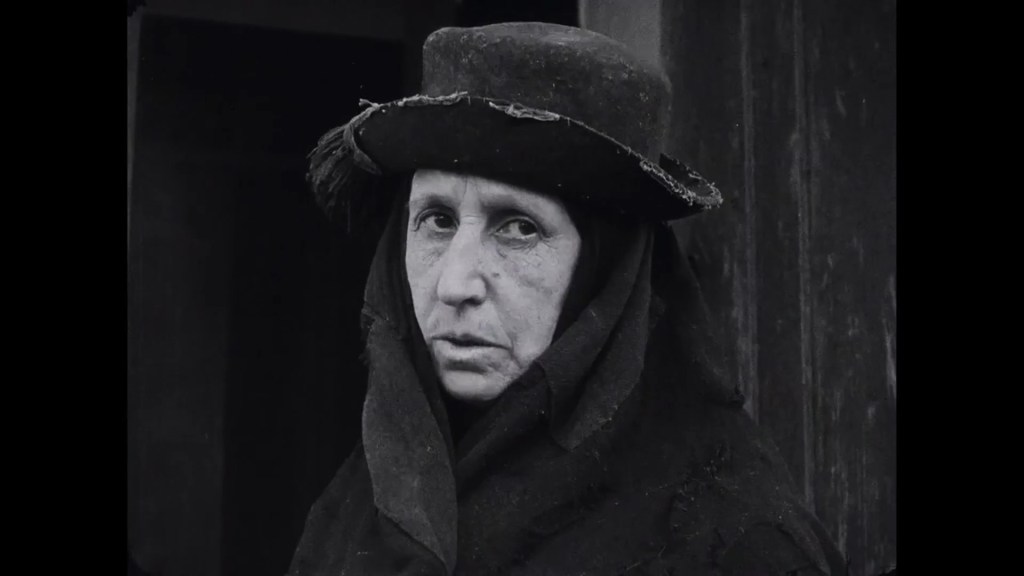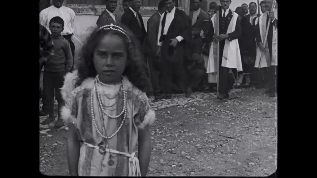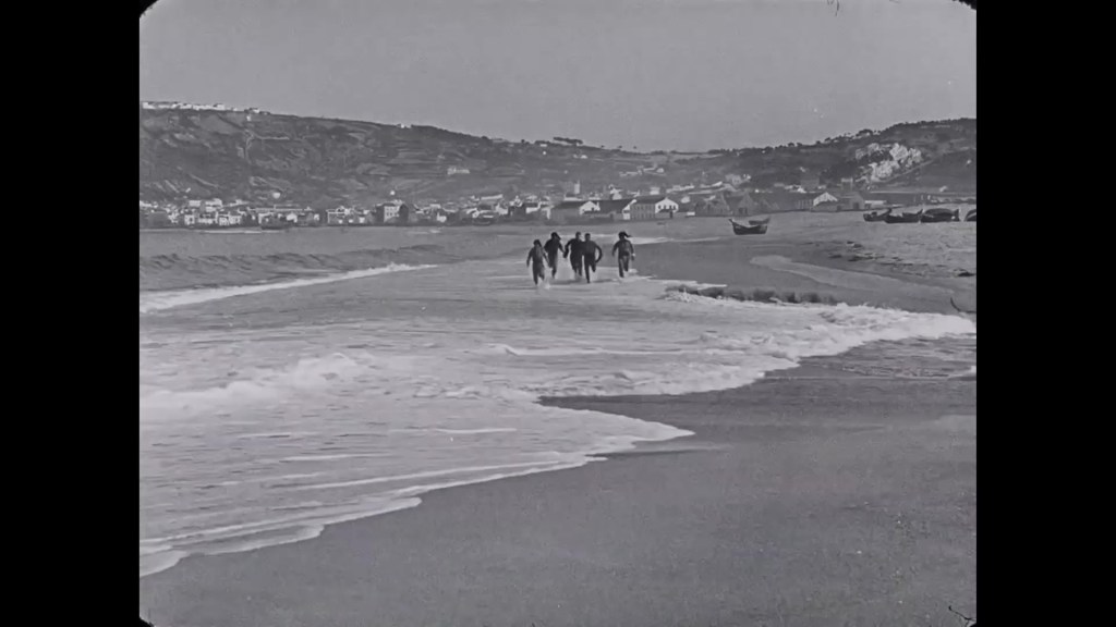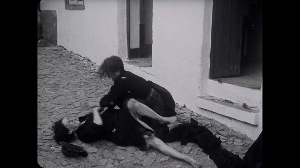 So then, the plot. Part 1 establishes place (Nazaré and its beach) and characters: Falacha, skipper of the boat Maria do Mar; his wife and his daughter Maria (named after the boat); Ilheu and his wife Aurelia (known as “Ilhôa”) and their son Manuel; the fishermen “Peru” (“the Turkey”) and “Lacraio” (“Scorpio”). Part 2 starts with news that the sea has broken the lines to the nets. Falacha decides his crew must set out in dangerous conditions. The local population gathers on the shore to urge them back, but it is too late: the Maria do Mar is wrecked. Part 3 reveals that Falacha is the sole survivor. He is dragged from the waves but then set upon by the families of the lost crew: they blame him for their unnecessary deaths. He goes to pray, but the widows pursue him: “God will never forgive you!” In despair, Falacha walks into the sea and drowns himself. In Part 4, Maria is now working in the fields and sells her produce in the market of Leira. Thanks to his mother’s intervention, Manuel avoids being conscripted and goes to celebrate with his friends. In Part 5, Maria and her friends from the fields encounter Manuel and his friends on the beach. Maria gets into trouble while swimming, but Manuel rescues her. The incident enflames local tensions, with Ilhôa clashing with Falacha’s widow. Ilhôa consults Patareca, a midwife conversant in witchcraft who places a “curse” on her rival’s doorstep. Falacha’s widow and Ilhôa fight in the street, only to be separated by Manuel and Maria. Part 6 sees Maria defy her mother’s ban and thank Manuel. They meet again, and then every day. Part 7, and the lovers marry. Manuel takes Maria home, but his mother ignores her. “She is the daughter of the man who killed your father! You can keep her – I’m leaving!” In Part 8, Maria’s mother in turn ejects the lovers. They find their own place and transform it into a home. Whereupon, in Part 9, Maria gives birth to a girl. Months later, when both parents are working, the infant is attacked by a rabid dog. Ilhôa refuses to care for it, as does Maria’s mother. At the same time, a girl of the same age is being buried, and the two rivals see the tiny casket being borne past them. Manuel and Maria rush home to find their mothers and all their neighbours gathered in prayer around the cot. The child was not harmed, and a “miracle” of reconciliation takes place. FIM.