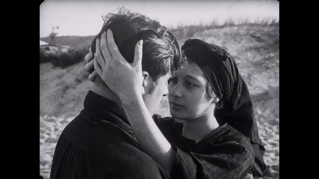 It’s quite something that a film that starts like this can turn into a romance, or that a romance can burgeon from this kind of despair – and that it does so organically, realistically. It helps that the two leads, Maria and Manuel, are such naturalistic, unpretentious performers. They are very striking on screen, without any sense of artificiality – the aesthetic whiff of stardom. The sequence in which they meet is extraordinary. Already the women have stripped off to their underlayer of plain linen skirts and top, while the men have rolled up their trousers and jettisoned their tops. In the women’s boat, the camera emphasizes the labour of rowing while also drawing attention to the sweat and bared skin of the rowers. When Manuel rescues Maria, the sense of danger quickly becomes erotic. He is half naked, and her top is half torn away, by the time he carries her out of the water. The film eroticizes them equally, perhaps him a little more – for the camera lingers on his wet, glistening torso as he pants. Their first encounter is both a brush with death and a kind of physical consummation. It points to the violence that their relationship triggers between their respective mothers, and is even reflected in their domestic life. Their first argument ends with Manuel giving Maria a slap: Manuel clearly embodies the way we have seen other men treat their women. But all their scenes together have a kind of physicality, a touchiness, that builds a strong sense of their relationship. Their kisses are real, their embraces strong. We see Manuel pull down Maria’s top to plant a long kiss on her back – and their final, lingering kiss at the end of the film sets the seal on this physical closeness.