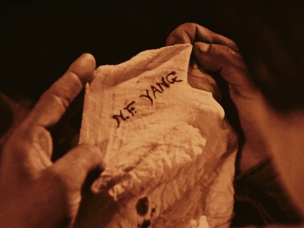 Well, I said this was a melodrama – and boy does it live up to its genre. Its contrast of familial duty and romantic longing, its intergenerational conflict, its rescues-from-the-water, its sudden illnesses, rapid ageing, premature deaths, and its concluding aura of saintly forgiveness are all familiar tropes. Love and Duty carries them all off with aplomb. There are also plenty of interesting touches that make the drama more sophisticated than simply a genre piece. The film is filled with interesting pairings, doublings, echoes: the lovers v. the married couple, the husband’s own interest in another woman; the two families of (half-)siblings, the two generations of paired sweethearts. Even the figures who remain constant between past and present (the husband, the servant) echo their past actions. Years after his first spreading of malicious rumour, the servant (called Fox) once more seizes the chance to spread gossip (thus bringing about more unhappiness), while Ta Jen repeats his vindictive behaviour – only to realize the damage his actions have done in the final scenes. (Here, the character’s somewhat weedy nature becomes a kind of moral strength: Ta Jen knows that Nei Fang has undergone great suffering, and his tears are genuine. Ta Jen’s earlier toughness seemed more the product of social pressure than genuine hatred. He is a small, almost comically unheroic figure, with his round glasses and prim moustache. At the end of the film, I readily accepted that this man could feel sorrow and acceptance.) There are also repeated gestures, like the holding of handkerchiefs as tokens of exchange, both when the lovers first touch after the accident and then again after the accident with Fei Nang’s first child. Likewise, in the latter scene, the way that Nei Fang revives the child after Tsu Yi rescues them from the water is repeated much later when she tries to revive the dying Tsu Yi. Or the writing of the note when Nei Fang leaves her husband, echoed in her sending him her suicide note at the end. Negotiating such a long film, and a long narrative within the film, is made easier and more effective by such means.