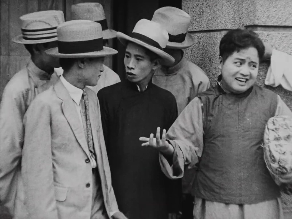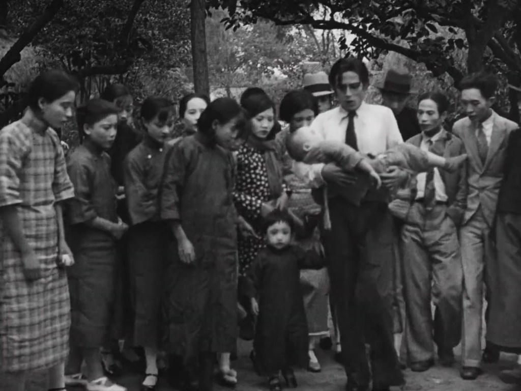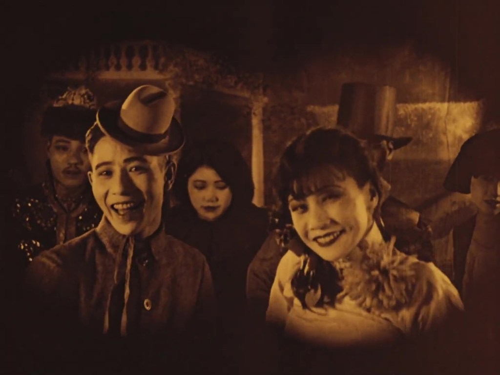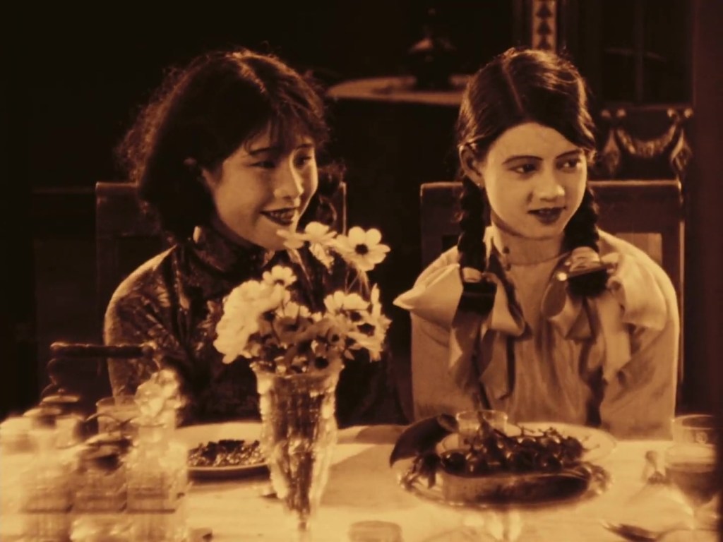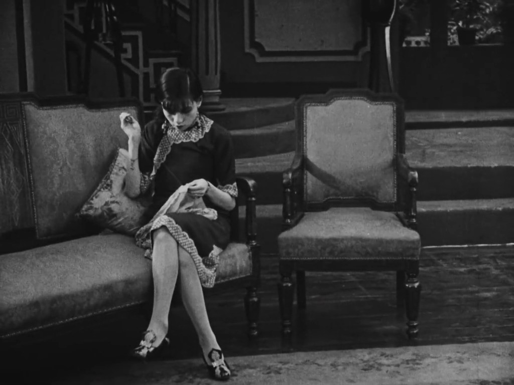 Related to this (imagined) presence of American film culture, I was also struck by the ways that Love and Duty looks out to western cultures. This is evident from the outset at the way even the film company’s logo of a flying plane suggests outward adventure, and how all the intertitles are original dual-language designs. There is also a contrast between the westernized clothing for the wealthier characters (marked out as such from their introduction) and the traditional clothing worn by the servant (and by Nei Fang herself when she is reduced to a humble trade in later life). The old Nei Fang also sees her children performing in an “international dance” on stage at a charity event – a curiously bland blend of western and music hall comedy. (Nei Fang is deeply moved, but I wasn’t sure how we are to take the contrast between her emotion and the apparent superficiality of the stage show she watches.)
