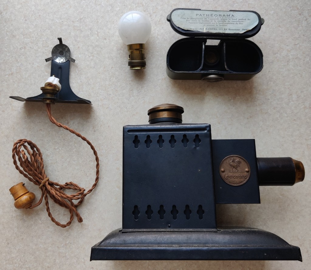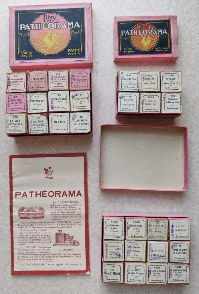 There is a tragi-comic coda to this little history. As I said at the outset, much of my collection had been bought for the sake of the classroom, where I let students have a play with the materials of film history that my otherwise entirely digital course lacked. Outside this context, I rarely used my collection at home. Time passed, and I eventually drifted away from academia (or vice versa). So I packed away my film history ephemera in a box and slid it under the bed. One night I knocked over my glass of water and this box was spattered. In what remained of the night, I went without sleep fretting over the fate of my collection – and wondering what the point of keeping it was without anyone who might share it or have an educational play with it. The idea snowballed until I considered getting rid of just about everything that I had accumulated for a now defunct career: not just the Pathéorama and other curiosities, but all my Gance collection, all my cinematic paraphernalia, all my DVDs, all my everything. In the end, the sheer volume of this material put me off selling it. But I sold a huge chunk of my DVD library, and I sold all the material I used for my teaching: the Pathéorama material, the stereoscope material, and sundry other bits and bobs. The Cocorico projector went to the United States, while the films went to Italy. The projector at least made it to its destination, whereas the films got stuck in customs. As far as I know, five years later, they’re still there.