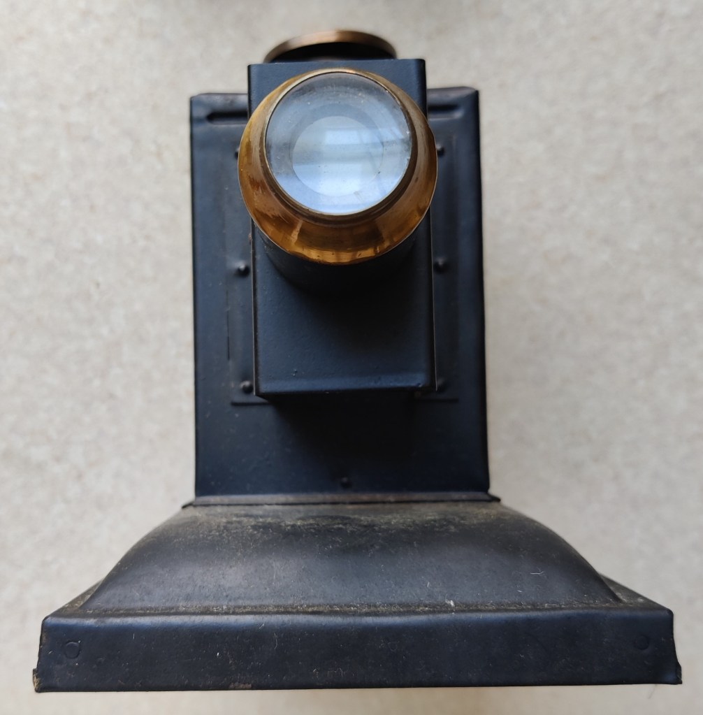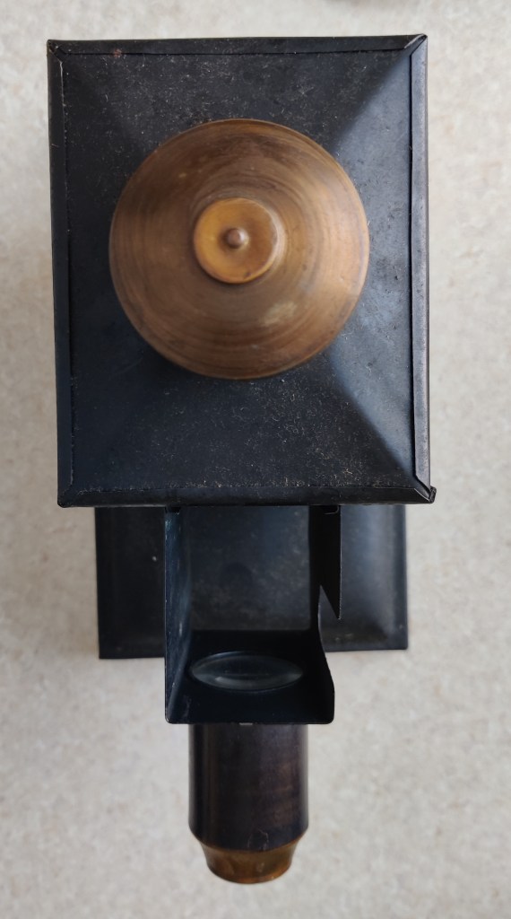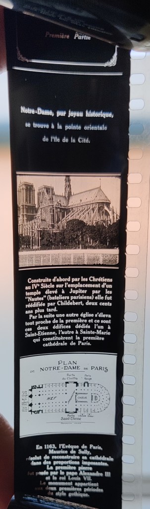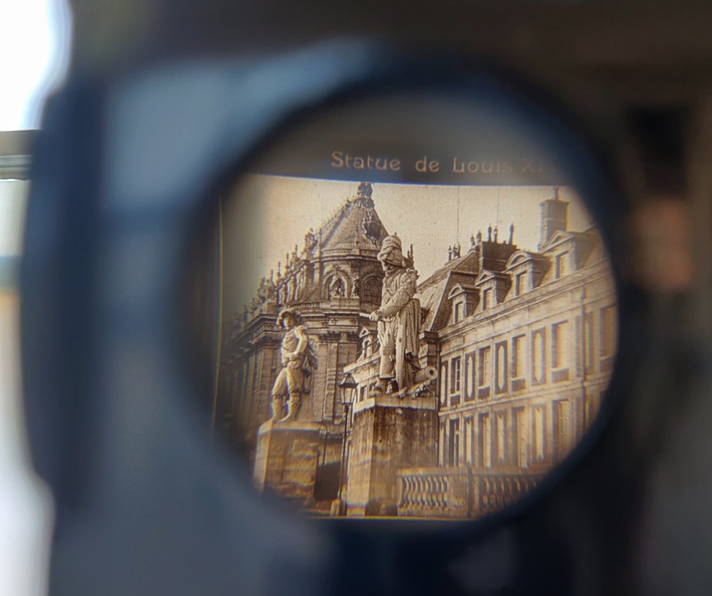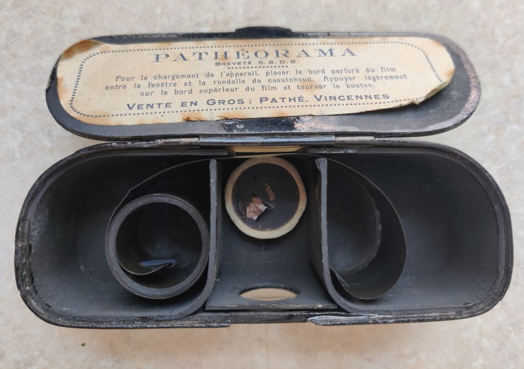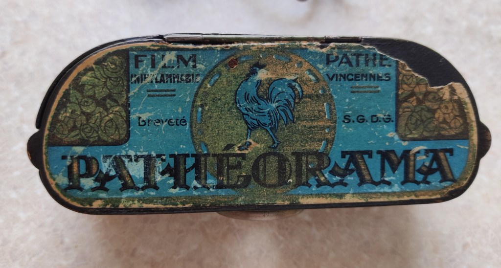 Here, I bought a chunk of inexpensive filmic and proto-filmic paraphernalia from the late nineteenth and early twentieth centuries. Sets of stereoscopic cards and matching “viewer” from the 1880s; a weird, cardboard-mounted strip of tinted frames from an unknown German film of the 1910s; and several boxes of Pathéorama films. Before purchasing the latter, I don’t think I had ever heard about this format. It was launched by Pathé in 1922 as another way of extending its market into home viewing. Cheaper and less cumbersome than narrow-gauge celluloid designed for home projection (17.5mm, 9.5mm etc.), the Pathéorama format is simple and easy to handle. Put simply, it consists of a small reel of 35mm containing single-frame “scenes” that are interspersed with intertitles. This strip of film is loaded into a Pathéorama viewer, a small handheld box which you hold up to the light: you then wind the film past the little peephole window and see the images. (I have included some photos of this process below.)