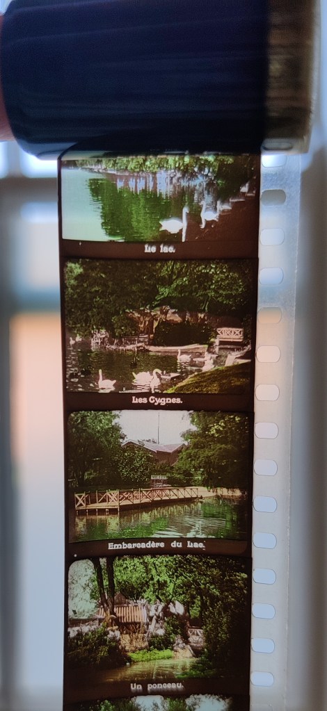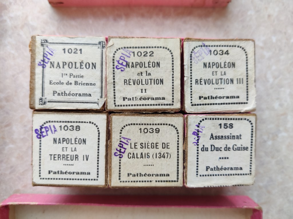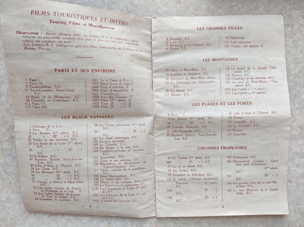 Thanks to a Pathéorama catalogue that came with the set I bought, I could browse the various categories of film the format offered. I say “categories”, but “genre” might be more applicable. Most of these genres are travel-oriented, providing touristic sequences of various kinds of location. Like the cinematic genre of the travel film, the Pathéorama format allowed the viewer to glimpse the wider world. Thus we can see the numerous catalogue entries (and the item codes for convenient ordering): “Paris et ses environs”, “Les beaux paysages”, “Les grandes villes”, “Les montagnes”, “Les plages et les ports”, “Colonies françaises”. Others were more focused on the art culture in these various locations, such as “Les series artistiques” (visits to museums, galleries, historical ruins like Pompeii), or specifically on sites of spiritual significance (“Les films religieux”). Many of these various genres of travel film were also tinted, allowing their little worlds to glow with colour.