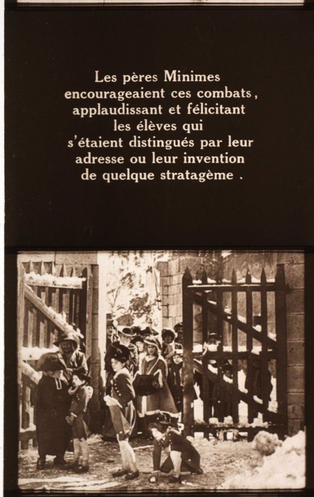 Among the many titles in this genre, my interest was immediately roused by the reels labelled “Napoléon”. Yes, indeed, Pathéorama released Abel Gance’s vast, multi-hour drama as a “ciné-roman” slideshow in several tiny reels. As you will see below, the 35mm frames used by Pathéorama are extracted from rather worn-looking prints from Gance’s film. There are scratches and dirt, as though these were copied from off-cuts – or simply printed with very economic means. Still, they are 35mm frames from Napoléon, and I rejoiced in my miniaturized exploration of yet another version of this endlessly morphing text. I was also especially intrigued by at least one frame from a scene (or at least a single shot) that was not in the cinematic film itself – or at least not in any version that I knew. Here, the child Bonaparte sits before a gate behind which mingle a group of adults. Who are these people, and where in Brienne college are they gathered?