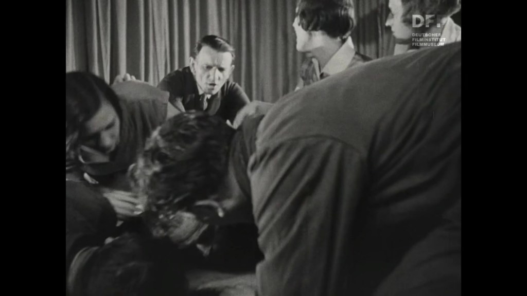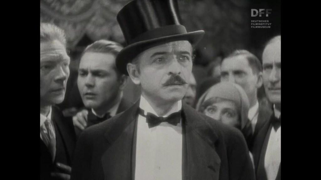 So to the day’s second half. We begin with the half-hour short, Soldier Man (1928; US; Harry Edwards). Harry Langdon is the soldier the army forgot. He has been left behind in “Bomania” after 11 November, not realizing the war is over. He stumbles around, fleeing phantom enemies, confounding local peasants. Meanwhile, King Strudel the 13th of Bomania (also played by Langdon) is fighting revolution, secretly being fermented by General von Snootzer. The Queen of Bomania hates the King for his drunken loutishness. The King is duly kidnapped and hidden in a remote barn, to be killed in due course. But the King’s loyal courtiers encounter Harry and recruit him to impersonate the missing monarch. He does so but is immediately the target of an assassination attempt by the Queen. However, it turns out that he’s a better kisser than the real King, so the Queen is disarmed. Things turn suddenly romantic, but Harry is tired. He goes to sleep on the King’s bed and wakes up in his real home with his real wife. He is a common soldier, after all, and the war is over. THE END.