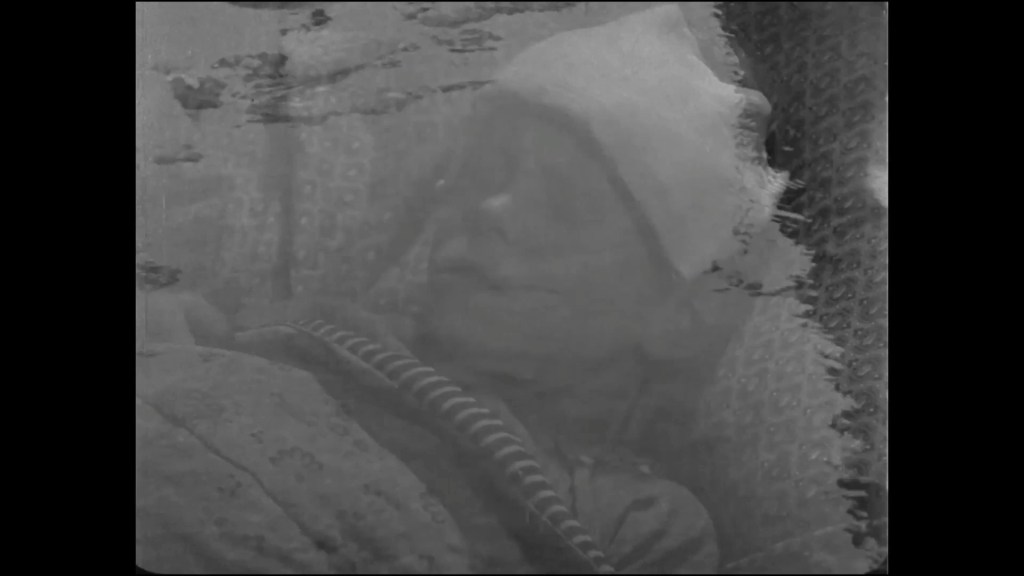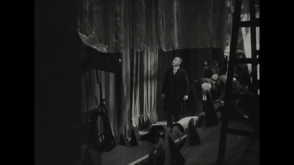 Though Langdon also plays the King, his double, this character is swiftly bundled off screen before Harry arrives. There is no attempt made for Harry to meet his doppelganger, to see the kind of man he might otherwise have been (aggressive, selfish, sexual, powerful). It is the innocent Harry who wears the outsize royal robes, and we might wonder how they can be outsized when they were made for his other self – for him. It is as though he is figuratively smaller than his own doppelganger, so that even identical clothes do not fit. His royal regalia are superfluous to his needs. He offers his crown to a courtier, as a vessel for him to vomit in – since Harry is so innocent he cannot think of another reason why the man should bow forward. Somehow, perhaps by sheer lack of arrogance, the Queen is seduced by him. Harry is hardly interested in her at all. She tries to kiss him, to distract him from her dagger, but he’s too busy eating a biscuit to have his mouth and lips ready. He doesn’t flinch away (he’s too obliging, too unquestioning, too accepting), but apologetically motions that he has his mouth full, insists upon chewing his food properly before swallowing. His kiss is successful despite himself, and when he retreats to the royal bed it isn’t for an act of consummation with his Queen but to curl up into a ball and go to sleep.