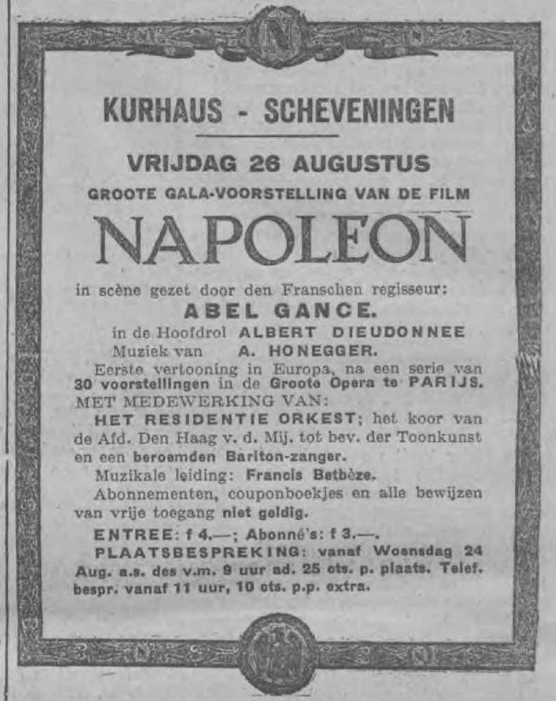 One other point about the score is the inclusion of a single piece from Arthur Honegger’s original music for the film, created for Paris Opéra premiere in April 1927. His name was absent from the musical table of contents issued in the recent Table Ronde publication on Napoléon, so it was a pleasant surprise to see his name in the concert programme. This sole piece, “Les Ombres” for the ghosts of the Convention sequence in part two, was eerie and effective – and distinctive. It is a nice, if brief, acknowledgement of Honegger’s work – though I am puzzled as to why its inclusion was not mentioned until the programmes were issued on the day of the concert. (Cloquet-Lafollye’s essay mentions Honegger only to reiterate that both he and Gance were dissatisfied with the music at the premiere.)