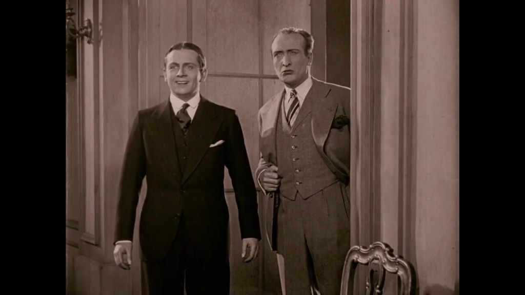 I must also mention Betty Balfour. Balfour was a major star of British cinema, maintaining her popularity with audiences throughout the 1920s. She starred in a number of foreign films as well, but I’m not sure her fame ever really had much impact beyond the UK. Even if her eponymous character is as superficial as the titular A Bit of Fluff suggests, Balfour holds her own on screen here: she’s happy to sing and dance and get involved in slapstick and farce. Balfour’s character is introduced as “celebrating the tenth anniversary of her 25th birthday”, but the film never makes her a villainous figure. (It’s worth noting that Balfour was only just older than 25 when she made this film.) She’s strong-willed and independent, traits which are never condemned. She also gets some nice lines of dialogue, as when Henry asks to borrow her necklace, to which she replies: “You showed my ring to a friend and she’s still looking at it.” Here, as often in the film, a single line of dialogue tells you much about the character and her relationship and past with others.