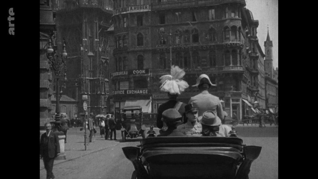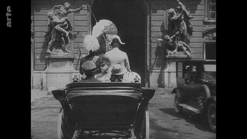 After the Archduke excuses himself, Nux is ordered to take Alix on the tour of Vienna. This is an utterly enchanting sequence. The camera tracks alternative before, alongside, and behind the carriage. It cranes up at the theatres and spires, drifting through the Vienna of – not 1900, but of 1925. The people on the street are clearly staring at the camera, at the stars, at the people in imperial costume. Reality bubbles at the edge of the fiction. And so too in the score. Beneath the gorgeously slow waltz there seems to be a gentle, only just audible, patter of hooves. The sound is so subtle it might be an extra instrument, a softened rattle over a drum. When Nux shows Alix the statue of Johann Strauss II (“Your Highness, the Waltz King!”, he says; “We have a dance violinist in Flausenthurn too!”, she replies), we get a refrain from that composer’s “Wiener Blut”. But it’s not just the choice of music here that works, it’s the way the score – as a soundscape – adds to this moment. As the pair approach the statue, the music is underlined by the faint crackle and hiss of (what sounds like) ancient vinyl. It’s a very subtle effect, as though something is burbling in the background of the orchestral music. Suddenly, the scene draws on another level of cultural memory. It’s not just the memory of Strauss, but the memory of the memory. It is 2025 remembering 1925 remembering the nineteenth century. Beautiful.