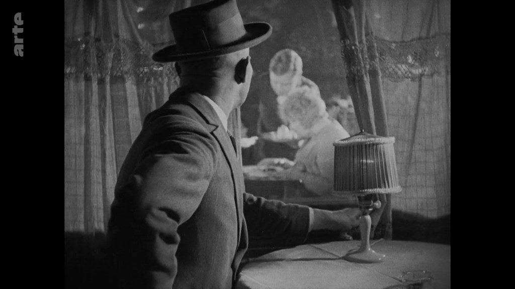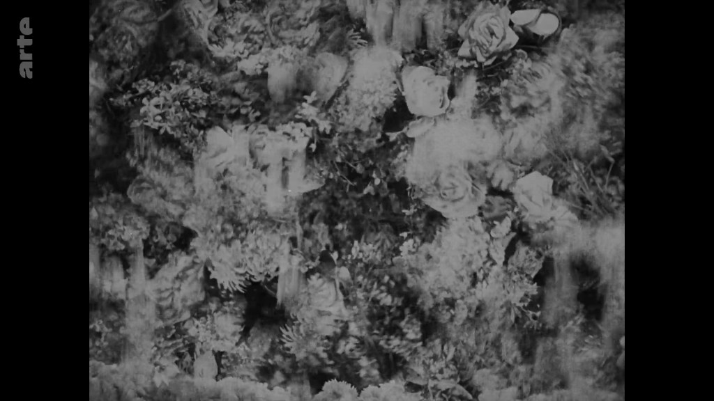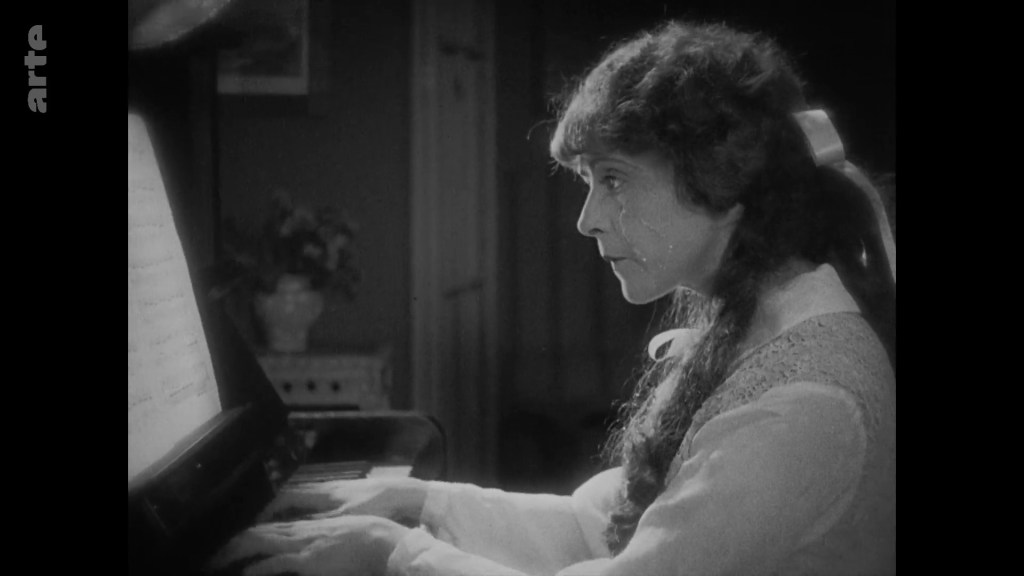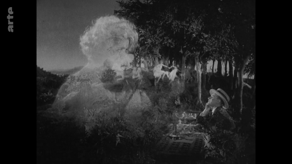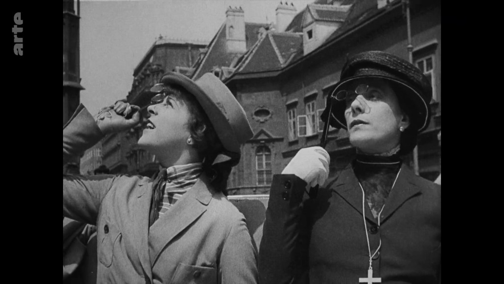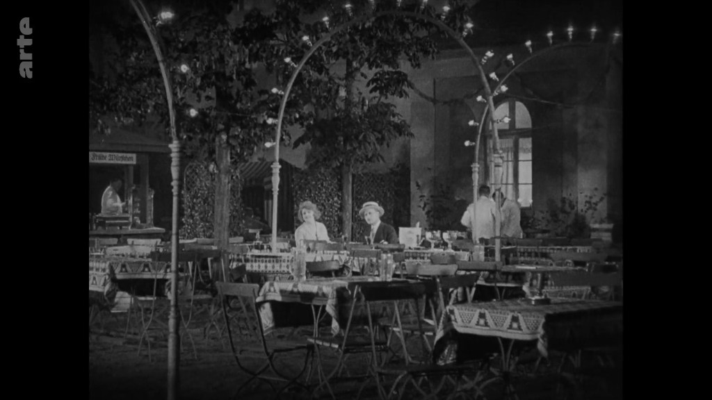 Nux’s romance with Franzi is also felt through the music. In the biergarten, the synchronization of Franzi’s female string group to “Wiener Blut” is perfect. (The programme for the concert on screen is even revealed in the notes Nux finds on his table, so the new score can clearly take its cue from this.) Franzi then takes her cue from Nux, who requests a Viennese waltz. Here, the score includes a historic recording of Strauss II’s “G’schichten aus dem Wienerwald” sung by Maria Ivoguen in 1923. The film dissolves to Nux’s daydream of the self-same Viennese woods, and dancing maidens, and the distant violinist. The song becomes a kind of dreamed sound, emerging from the film – even from the mind of Nux. (The film builds up the visual reverie with multiple superimpositions, kaleidoscopic effects of blossoms falling, piling up, and swirling like an abstract waltz.)