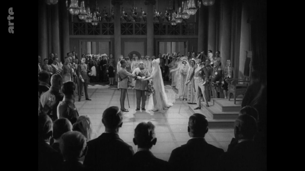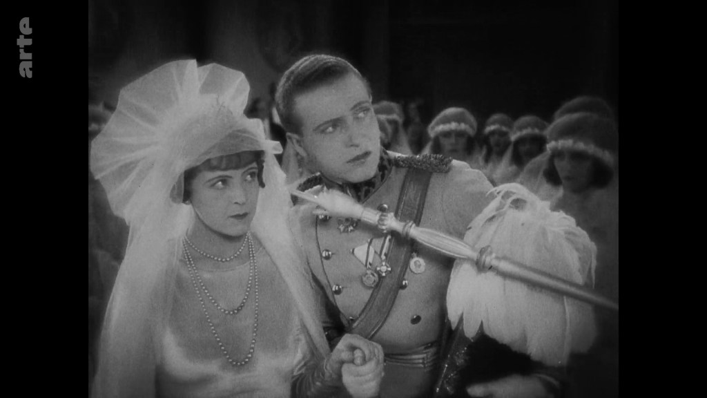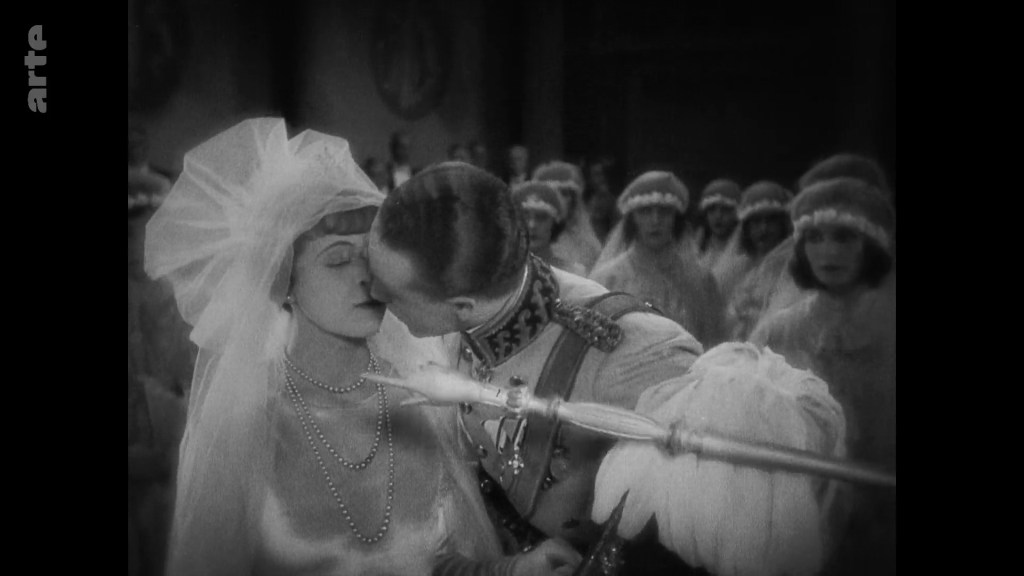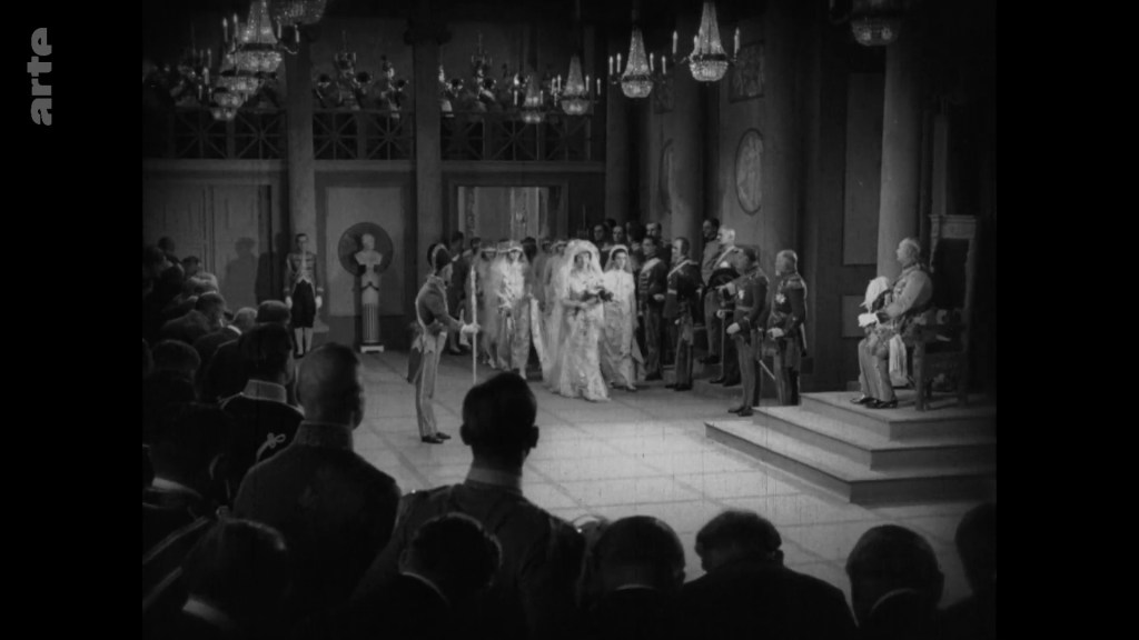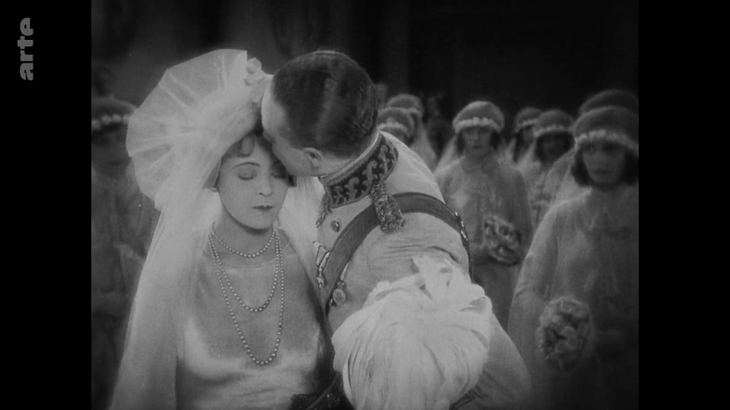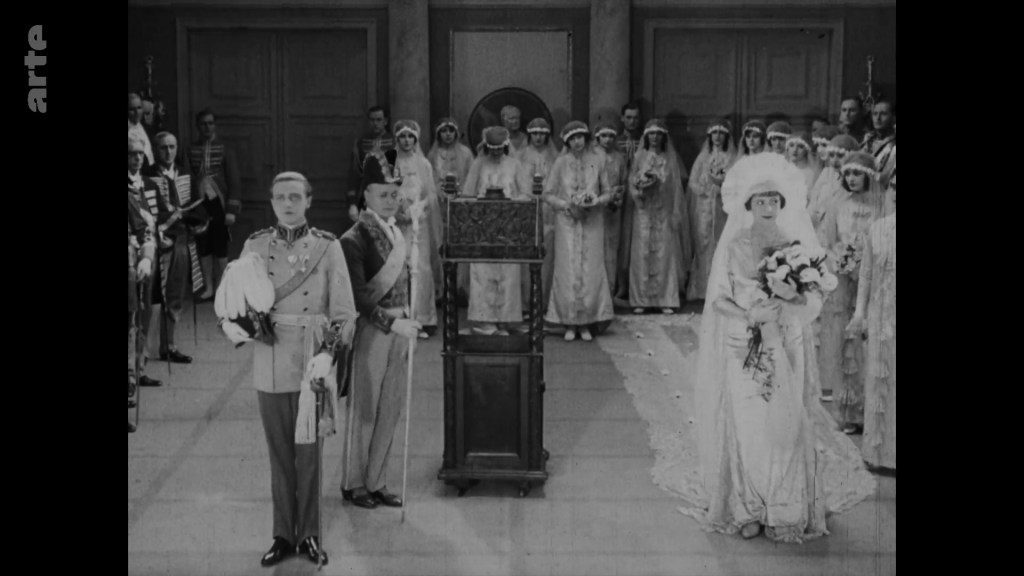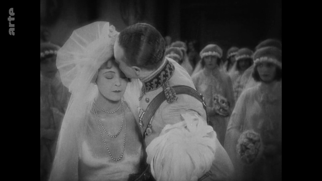 If there is fun and wit here, I also love the choices enhance the emotional depth. As Alix prepares for her wedding, Rodríguez cites a few bars of the second movement of Schubert’s Symphony No. 8 for the wedding preparations. It creates an immediate sense of solemnity that is brief but deeply moving. It’s suddenly very serious and meaningful. During the wedding itself, I also noticed a familiar Monteverdi fanfare (the opening toccata from L’Orfeo (1607)). I recalled Günter A. Buchwald’s recent use of this piece in his score for Casanova (1927); there, I didn’t like the way it was used for the harsh irony of its orchestration and employment, in absolute contrast to the tone of the film. See the difference to how it’s used here by Rodríguez inEin Walzertraum, which is delightfully pompous and in accord with the elaborate ceremonies that the servant relays via increasingly lengthy (and absurd) intertitles. The music is taken seriously, which is the point of the sequence – the pomp of the past, the pomposity of the court and its king. But it doesn’t stop the sequence being funny, indeed it enables it to be both funny and moving.