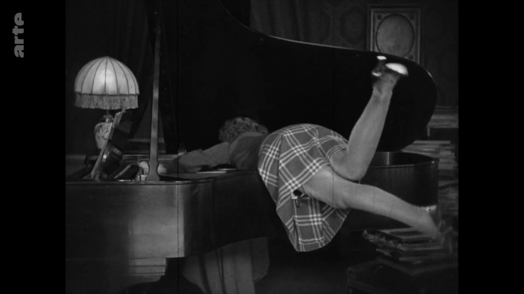 The outcome of the above scene is also intriguingly played. Alix has made herself attractive to Nux by mimicking Franzi’s appearance, and the way she reveals her new self – by half-hiding behind a chair, by leading Nux on, allows Christians another chance to show the sophistication of her performance. The film also plays on the fact that Alix is unwittingly recreating the very facets of her rival that drew her husband to Franzi. Alix’s gesture of retrieving her lighter from inside her top echoes Franzi’s retrieving of the note inside hers. (Meanwhile, Franzi echoes Nux’s gesture of tearing the bridal veil as she tears and refashions more of Alix’s clothes in the next room.) But instead of Alix consummating the marriage with Nux at the end of this scene, Alix ends up kissing Franzi in thanks for transforming her life. Across much of the flirtatious reconciliation of Alix/Nux, we hear the “Couplet der Ninon” from Straus’s Eine Frau, die Weiss, was sie will, sung by Fritzi Massary in 1932. But Rodríguez’s musicians in 2025 provide the orchestral force behind (and to some extent over) this historic recording. Indeed, the rumbunctious orchestra threatens to overwhelm the (female) voice, as Nux’s blood is up and he chases Alix around the room. There is comedy here, but also a faint air of threat. (Here, as so often, you have to admire the orchestration, which seems on the brink of disintegration into some far wilder, less tonally coherent.) It’s another incredibly suggestive way of using modern and historic music together, producing not just a pleasing sound but a sonic (and thus dramatic) tension. It also nicely echoes the film’s introduction of Nux, when he was chasing a woman around his office. Over this early scene, the orchestra accompanies another historic recording of “O-La-La” from Straus’s operetta Der lezte Walzer, sung by Fritzi Massary in 1920. Rodríguez’s score thus repeats the pattern of movement (a kind of barely-controlled waltz as man and woman chase each other round and round) and the pattern of musical citation.