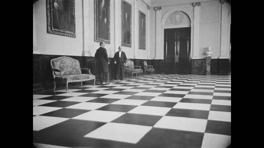 The couple go to Provence (a brief, glorious glimpse of the outside world—exterior shots of silhouetted hilltop towns). The General is visibly ageing. He waves a gun around, half inviting Death to confront him. (She wears another long-sleeved dress: she looks like a glamorous medieval princess.) The wind rises. Dogs bark. Petrov is ordered to release them. He goes through the cavernous villa, sets them loose. Henri is outside. The wind blows through the doors. The General shoots into the heaving wilderness outside. L’Herbier cuts back and forth between exteriors, interiors, faces, places. A shot is fired. A dog falls dead. Henri’s journey to the interior seems to last forever. Long enough for the General to try and force himself on his wife. He’s just revealing her flesh when Henri appears at the threshold. He pulls a gun. For once, he looks serious—convincing. He’s come for Natacha (who is busy emptying the General’s revolver). The General wants to duel, and the men pace out the distance inside. The General looks apoplectic, so much so that he drops dead of rage and age before he can fire a shot in anger. Natacha has been clutching desperately at Henri, the cutting dragging out his bizarre self-induced death. Now the lovers are together, but what is their future? Henri puts on his coat, holds out a hand. She puts out hers, and again the past dissolves over the present—as Dimitriev’s hand also reaches out to her. FIN.