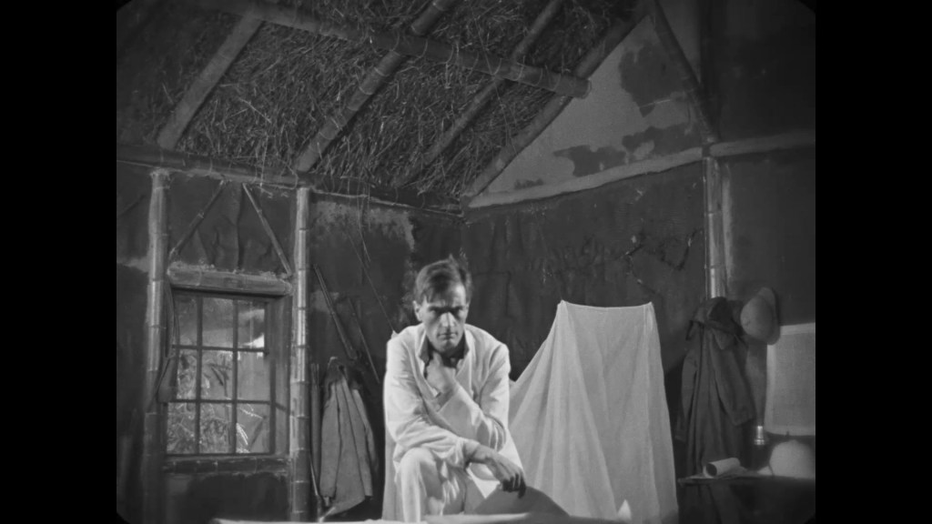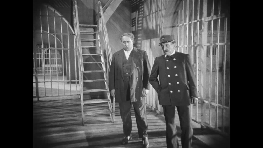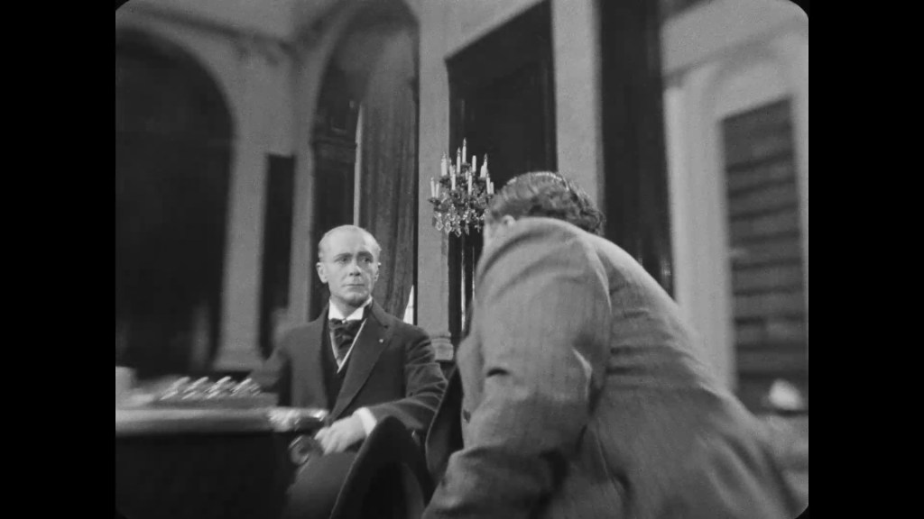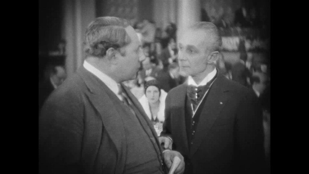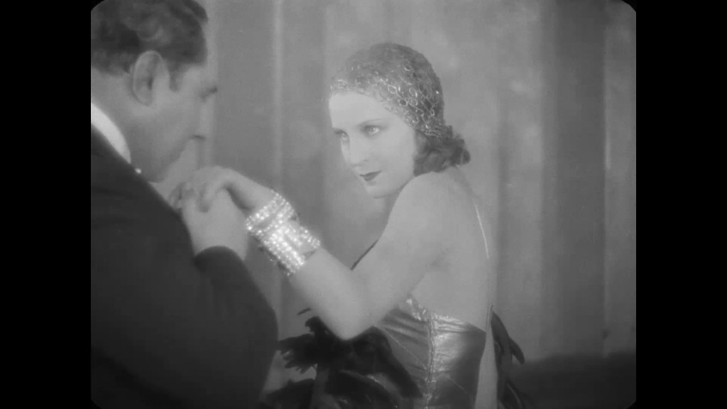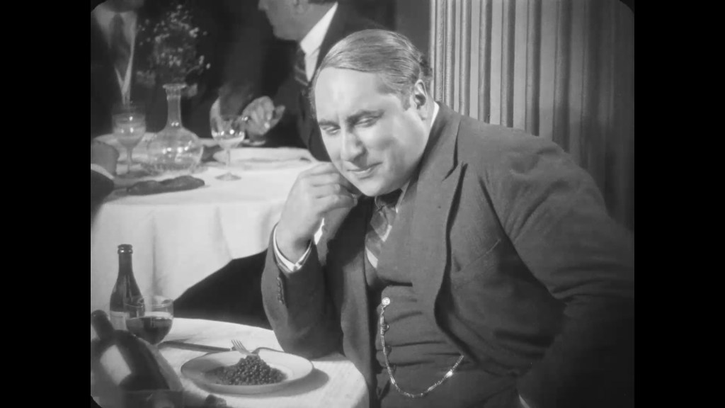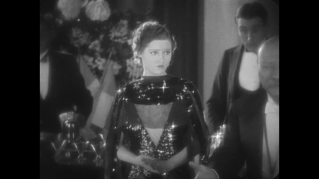 The General finds a photo of Natacha and Dimitriev together (no, not like that—staged, but intimate). And Dimitriev arrives, beckoned in eagerly by Natacha. They run at each other, and L’Herbier’s camera twists to catch Natacha’s last leap into his arms. The couple escape their present danger by remembering the past… A flashback to the scene captured in the photo, here spelt out in a single tableau of dancers, of shadows, of an embrace. (But I’m not moved, nor is Petrov, the guard, who spies on the lovers in the present—he almost looks to camera, as if to say, “What nonsense”.)