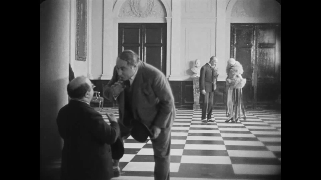 The “vertigo” of the opening title is induced by delicious lines that form a false perspective, funnelling down into the L and V of the film’s title. It is 1917, Petrograd. A snowy square. Events overseen from the windows of a house. Count Mikailov (Roger Karl) and his young wife Natacha (Emmy Lynn). But whose return does she anxiously await, a title asks us? It isn’t her husband, given a foreboding entrance—composition in depth, doors opening, guards on hand. Roger Karl is, as ever, a stern elder figure—made sterner, but also more comic, by a huge moustache and picture-book epaulettes.