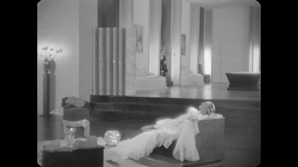 Has it? In all honesty, one image in Le Vertige did grab me, emotionally. For me, the best shot in the film is the image of Natacha looking through the huge window to see Henri for the first time. Showing her entrapped, with the dark clouds naturally superimposed by the glass, the shot is so beautifully potent, so full of feeling and meaning. The trouble is, nowhere else in the film did I feel this same sensation. I saw evidence that I was being cued to feel something, but the feeling never came. The image of Natacha behind glass reminds me that I tend to prefer films with a little more fresh air blowing through them. Perhaps it’s because I’m from the countryside that I long to see a director use real locations and exteriors to good effect, and in Le Vertige we get only superficial glances out the window, a handful of establishing shots before L’Herbier swiftly moves inside to show us his interiors. Sadly, fussy modernist design—something in which L’Herbier specializes—holds my interest for only so long.