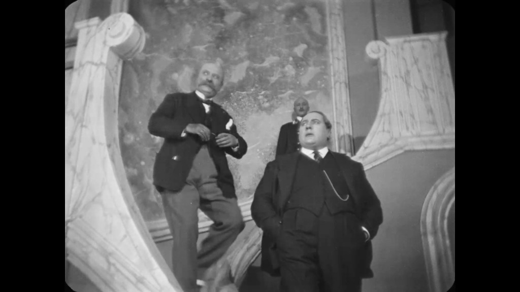 Chez Henri, a friend, Charançon (Gaston Jacquet), teases him about his disappearing from the social scene. A woman no doubt, but who? The friend conjures exotic possibilities, only for the woman herself to turn up. More comic running about by Catelain, this time with his friend. And when Natacha arrives, they both see Petrov on the street outside, following her.