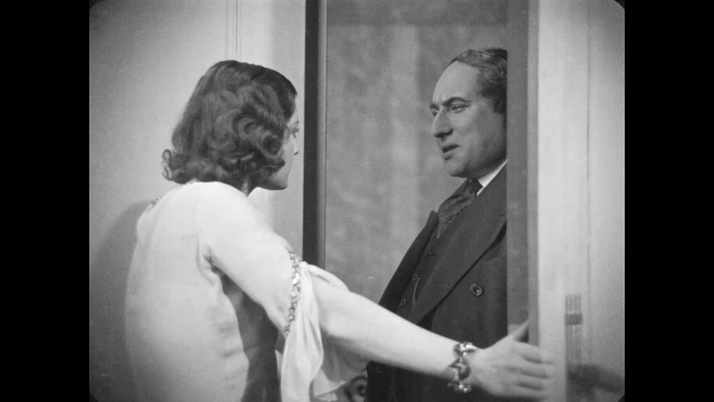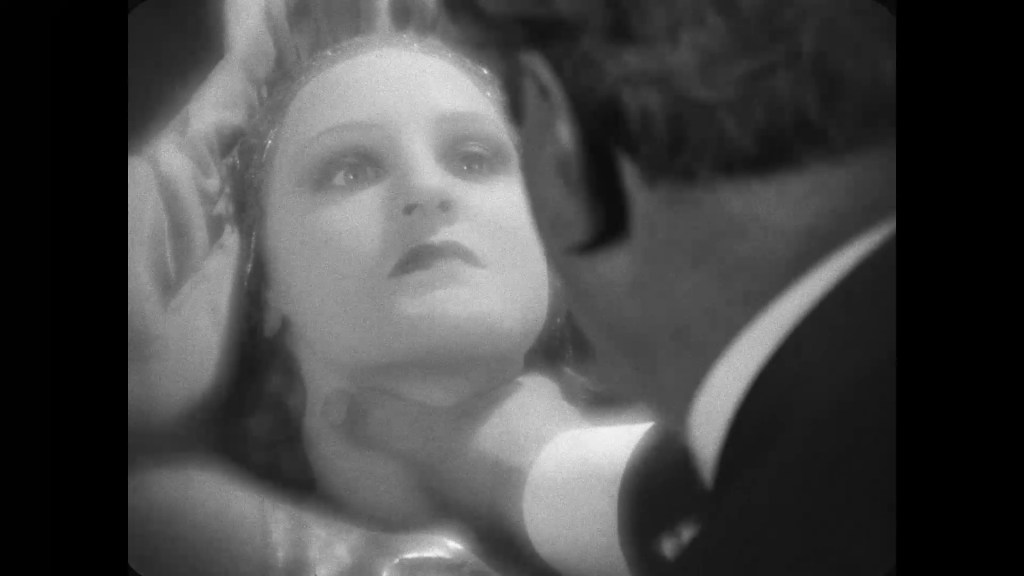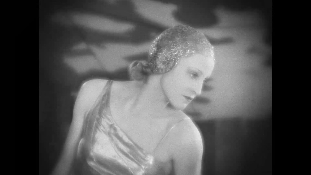 The scene proceeds. He seizes a chance to kiss her hand. She recalls the real past, a real kiss from Dimitriev. He looks sheepish, guilty, confused by her sultry glamour. (The dark dress, the dark hat, the dark veil—and dark eyes, and dark lips.) She sees a photo of him in uniform and it makes him giggle, giggle until she moves in for a kiss—but the telephone rings. She goes to the piano, plays the wedding march. He approaches. L’Herbier gives him a close-up that is threatening, sinister—the bars of a backlit screen behind him, then his face blurring, her face blurring. The past bleeds (dissolves) into the present. Her memories take over. A distant kiss replaces the real scene, the real Henri moving closer. His arms are around her, he grapples with her. Their kiss—is it willing?—shown reflected on the black sheen of the piano lid. It’s marvellously sinister, as is the dissolve to—later. She is leaning back. Again, how willingly has she submitted? He demands to know more about her, grabs her again as she goes to leave. “Try to tread the truth in my eyes. And if you see it, stay silent.” With this, she leaves.