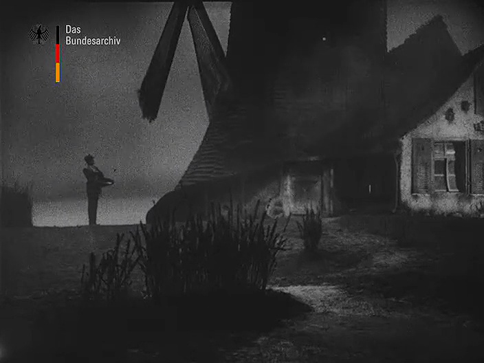 The baby is born. “He too will go to war—he too will kill people”, the mother mourns. “No, he will build new mills”, says the father, as superimposed artillery fire dissolves over the image of the family in the farm—like a Biblical scene—and the world is a vision of nighttime split open with fire. “Lord forgive them, for they know not what they do”, says the father, as the ghostly mill becomes a cross looming over the smoking battlefield. Ende.