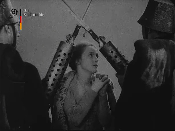 “Stand up!” the officer (Victor Janson) roars. It’s all stillness now. We can take in the strangeness of the infantry: their metallic helmets (half jäger’s shako, half “coal scuttle” Stahlhelm), the odd cages around their rifles that makes them half resemble automatic weapons. The officer has his rank on his chest, an oversized treble chevron. Touches of expressionism that creep into this half-real world. The mill is commandeered for supplies. The younger men react violently. Brigitte is restrained. Her young brother is taken outside. Brigitte’s glowing face makes the officer halt is roughness a moment. The man is clearly smitten. (It’s like the moment when the villain in Die Liebe der Jeanne Ney is overcome by the extreme close-up of Brigitte’s face.)
