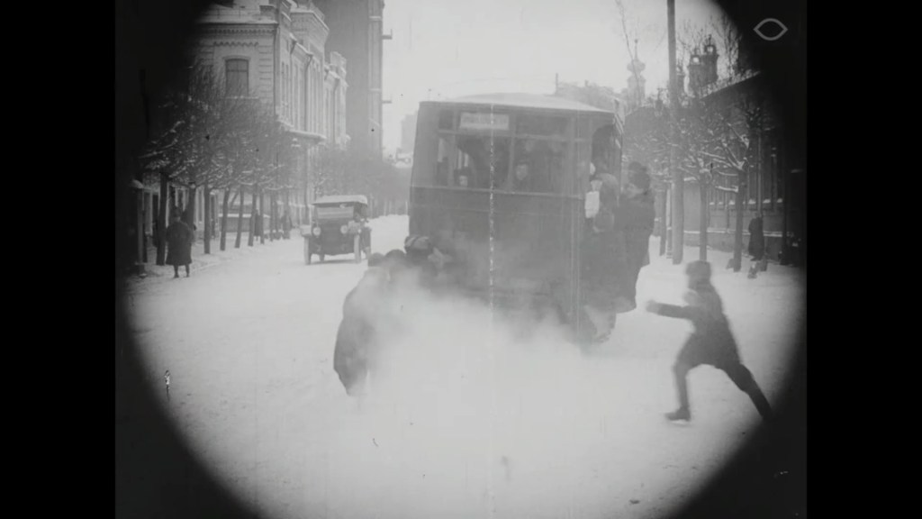 When Filimonov emerges from the tram onto the streets of Leningrad, his absolute disorientation is made the subject of bursts of rapid montage, mobile camerawork, and a delirious repetition of images. Deshevov’s music is like a kind of panic attack in sound, with its repeated, threatening, bustling, grandiose, rising progressions. The sequence is the first of many times that the film seeks to show off what has been achieved by the Bolsheviks while Filimonov has been away. But what the music does is make this very act of showing off almost terrifying. It is too upbeat, its tempo too rapid, to offer anything in the way of comfort or consolation. It is alienating rather than accommodating. This music makes you feel pity for Filimonov’s confusion, the confusion of a man as yet unconverted (and unconvinced) by Soviet Russia. The effect of alienation becomes ours as much as his.