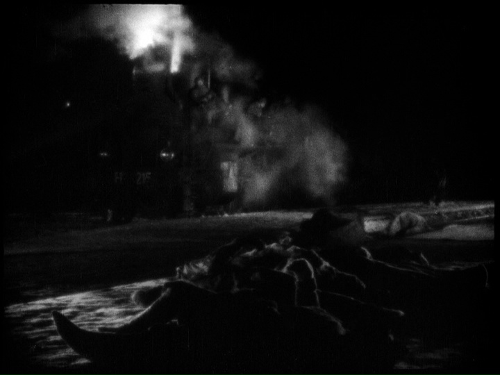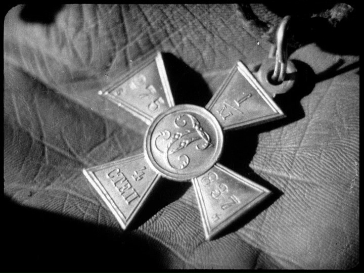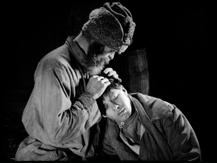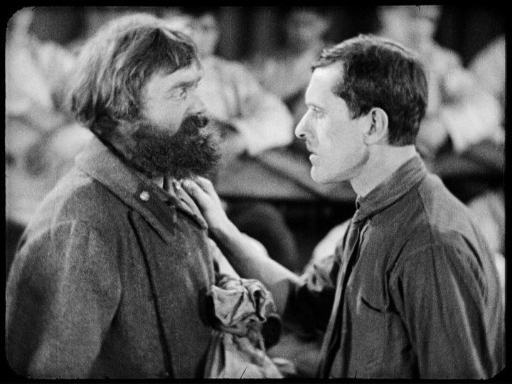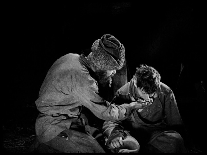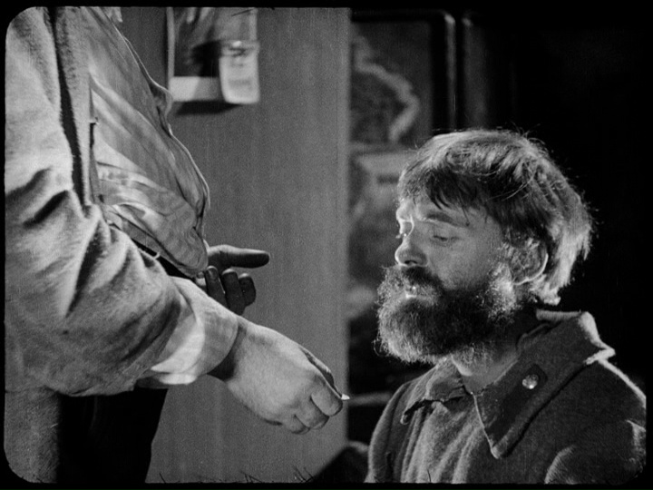 Elsewhere in the opening half hour of the film, Filimonov’s involuntary flashbacks are dazzling – quite literally dazzling, since the rapid cutting between evocative images is a shock for our senses, too. I love the sewing machine than turns into a machinegun, and the way Filimonov seems to generate the very montage of the film with his manic turning of the wheel. But I think that when this sequence eventually morphs from a subjective memory to an outright lesson in propaganda (cutting between the two officers from either side demanding their men fire on the two figures), the sequence loses its edge. Setting out to emphasize the inhumanity of the officers on both sides, it loses rather than gains emotional depth. And while the cutting between spaces and people is complex, it doesn’t have the same poetic motivation as the earlier memory flashes: it has become an exercise in intellectual montage. Compared to the similar sequence of the laughing gas in Dovzhenko’s Arsenal (1929), in which there is likewise a scene of officers threatening their own men, Ermler is less hallucinatory, less strange. By the end of Dovzhenko’s sequence, we seem to have lost touch with a continuous reality altogether. Unlike the growing nightmarishness of the gas sequence in Arsenal, Ermler’s combat sequence becomes all too comprehensible.