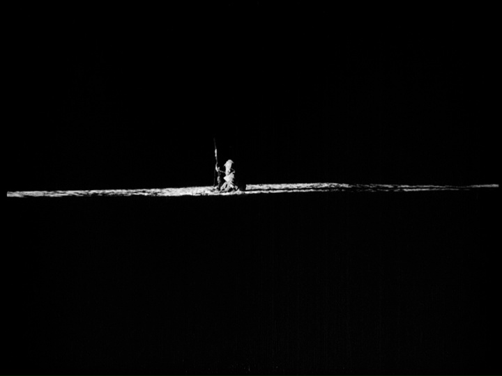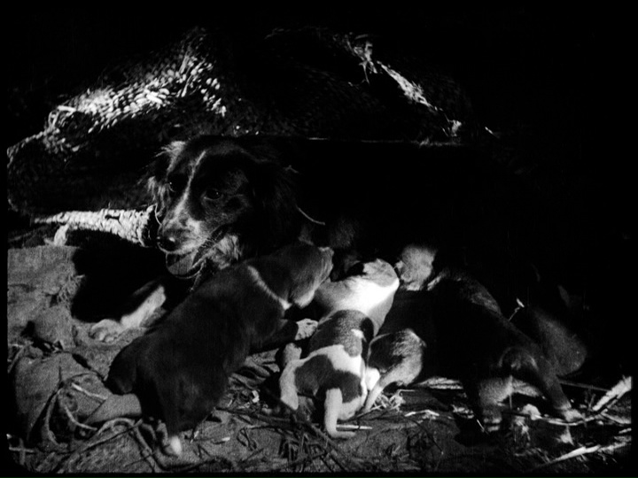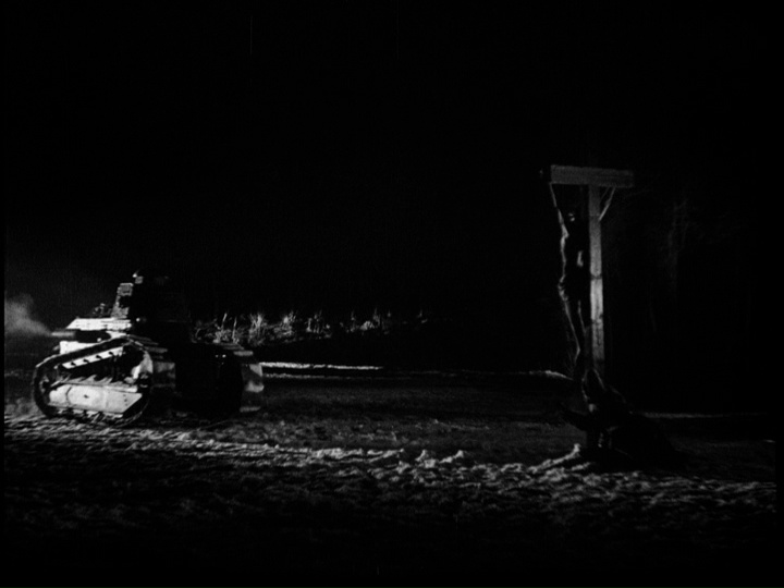 Of course, Nikitin is placed in the middle of an absolutely extraordinary series of scenes and images. The early scenes in which we glimpse Filimonov’s returning memories contain some amazing moments. I love the images of the frontline at night. Spotlight beams crisscross the black expanse of no-man’s-land, and two soldiers from opposing sides slowly approach one another. It’s an image of startling, surreal intensity. The richness of the film’s restored image – those impenetrable blacks, those searing highlights – makes such moments all the more effective. Of course, the famous (and famously censored) sequence of the gasmask-adorned crucifix is just as strange and unsettling, but it is part of a rich, dreamlike landscape of monstrous images. The way the enemy later appears with the train, likewise silhouetted in the harsh beams of spotlights, is just as nightmarish. And the scene in which the wounded soldier suckles from the dog, and the desperately poignant close-ups of man and beast, are simply astonishing. The war appears as a series of terrifying vignettes cut into the darkness, a darkness both real and metaphorical. These scenes are flashes of memory, of trauma, from a history that is too vast and too overwhelming to remember – or to see – in its totality.