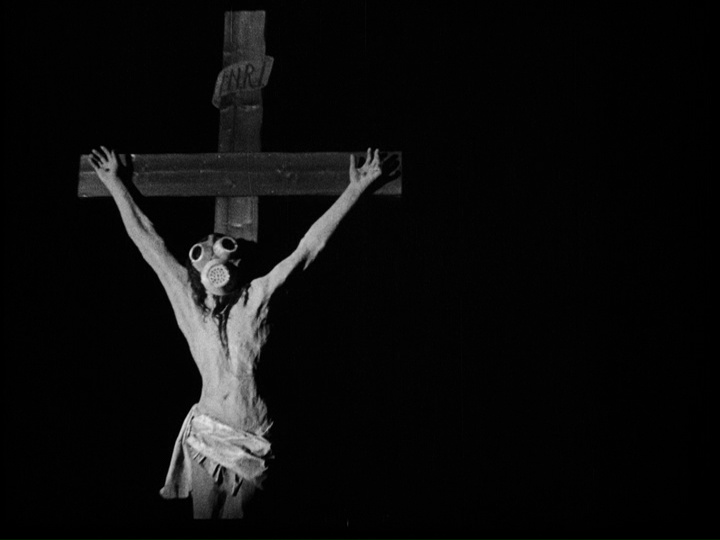 Part of this weird emotional effect is due to the original music by Vladimir Deshevov, as transcribed for piano in this recording by Daan van den Hurk. There are some superb sequences of sound and image interacting, often in ways you don’t expect. Take the early flashback sequence in which we see the Russian soldier praying before the crucifix. Visually, the image of Christ wearing a gasmask is jarring and surreal. Illuminated against the dark night sky, this figure of compassion becomes one of threat. But the soldier prays anyway, and Deshevov’s gorgeous, slow chorale throughout the start of the sequence gives a powerful sense of pathos and pity. If the image of the tank crushing both crucifix and soldier ends the scene with a grim punchline (demonstrating both the lack of mercy in war and a lack of religious authority to protect), the preceding music deepens the empathy we feel. As throughout, the score provides a degree of humanity that the images either cannot quite achieve or deliberately do not wish to achieve.