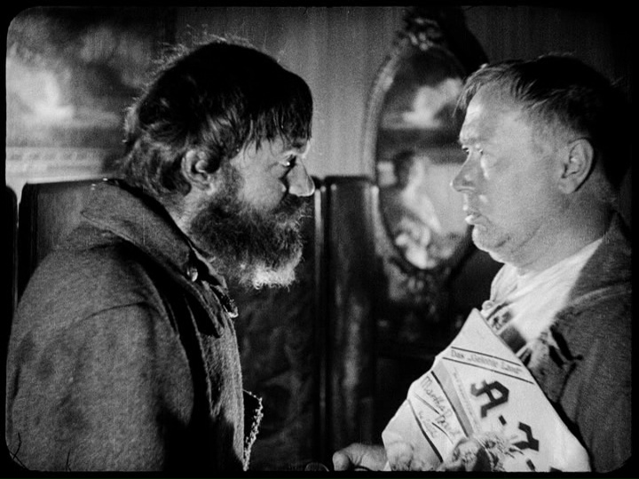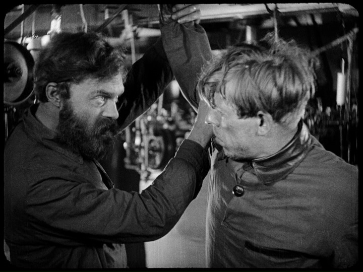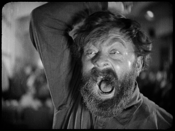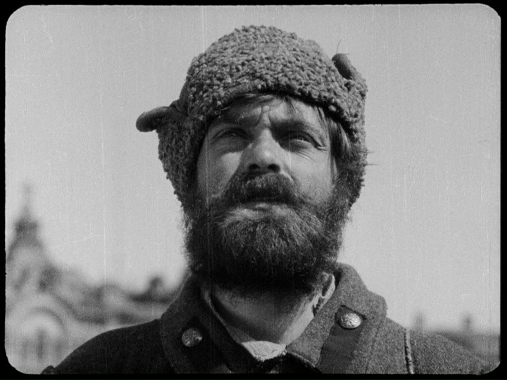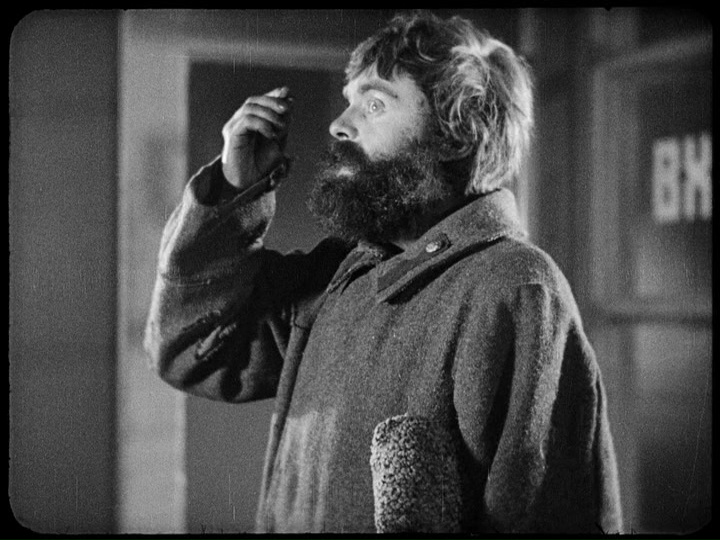 Though Fragment of an Empire is a work of propaganda for the state, it focuses its themes through a remarkable portrait of one man’s subjective trauma. Fyodor Nikitin is the heart of the film, and his performance is one of the most astonishing in Soviet cinema of this era. I found his vulnerability and tenderness (especially in the early portions of the film) absolutely heartbreaking, just as his bouts of violent hysteria are genuinely frightening to watch. When he is in the factory, more and more confounded by the attitude and organization of the workers, he repeatedly screams: “Who is the master?!” Caught in a medium close-up, his arm raised above and behind his head, his face contorted with insane confusion, Nikitin is simply terrifying: at once contained by the frame and threatening to smash it to pieces. (God how I want to see this on a big screen!) I’m not surprised to read that Nikitin seemed to become genuinely unhinged on set, with Ermler supposedly having to threaten him with a pistol to coerce him back under direction. I can hardly remember so vivid a performance of emotional trauma, nor one that – even at its most furious – is always somehow sympathetic. Even when he is screaming and raging, this man is pitiable, vulnerable. He is surely one of the most human, and humane, figures in early Soviet cinema.